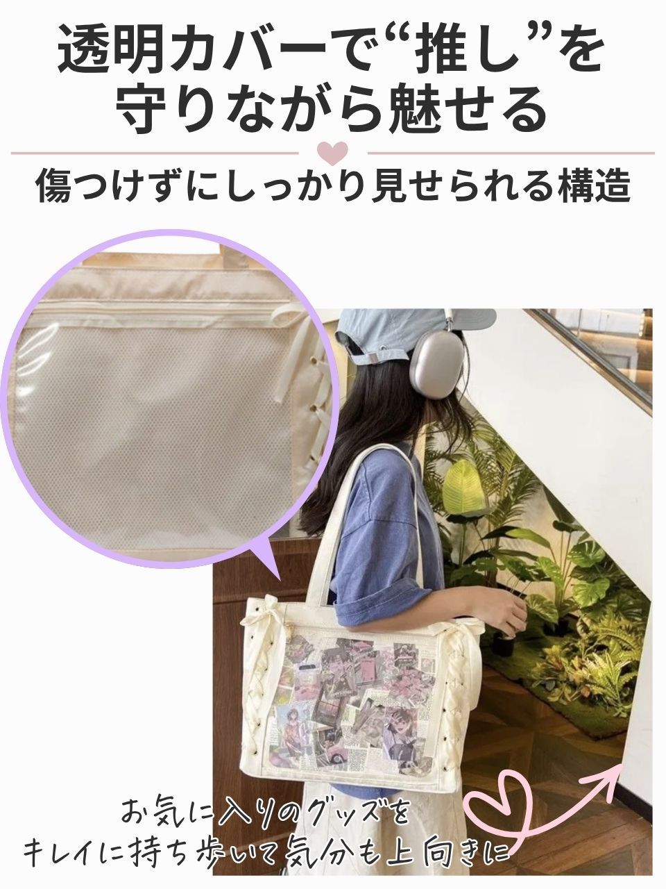 透明ポケットの内側にはメッシュ生地を採用しており、缶バッジやキーホルダーを取り付けやすい構造です。中身を傷つけにくく、アイテムの配置がしやすいのも魅力です。好みに合わせて自由にレイアウトを工夫し、自分だけの推し活スタイルを楽しめます。