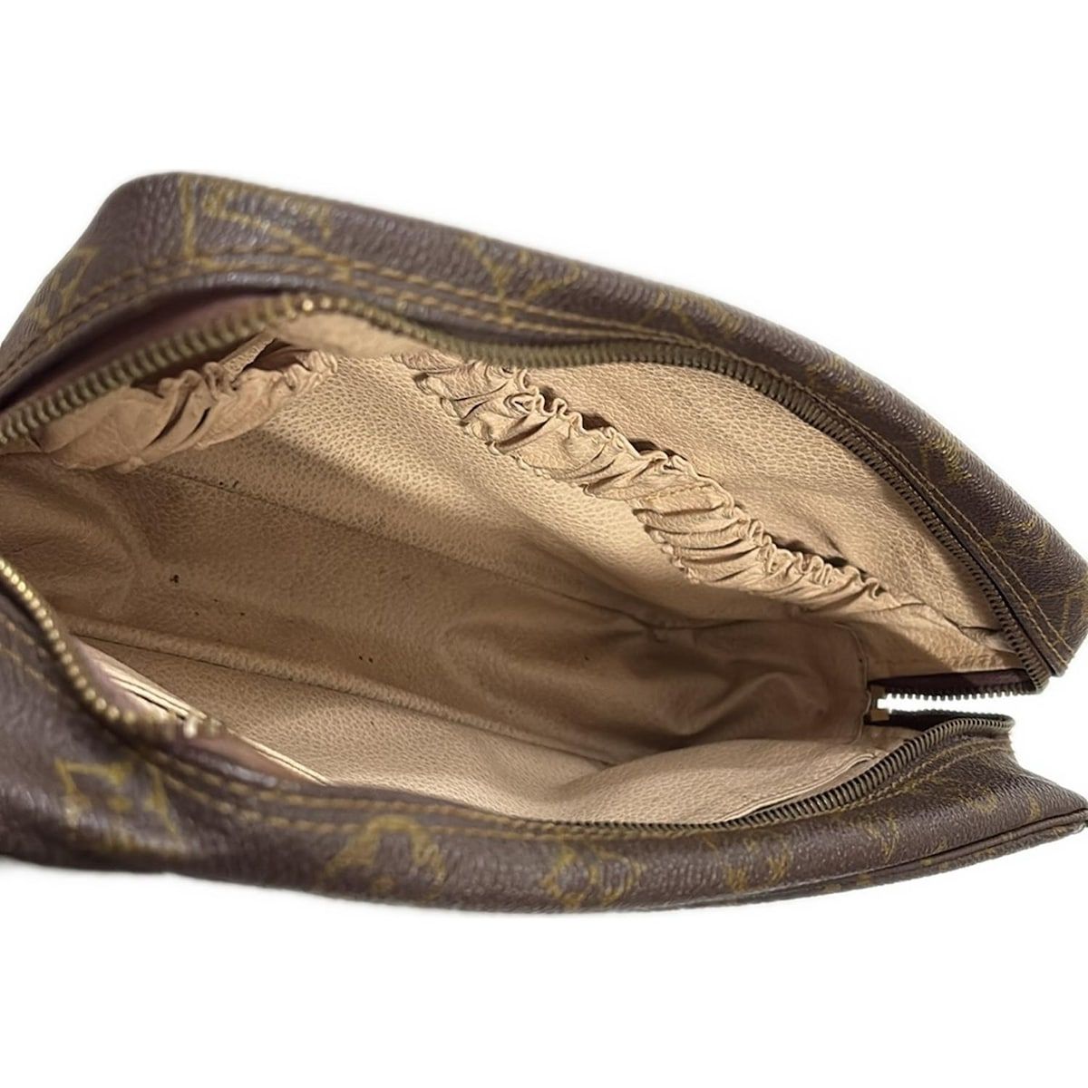 デザイン:ヴィトンのメイクポーチの中でも特に人気の高い定番モデルです。手ごろなサイズで、ボトルホルダーが備わっており、収納に安心感があります。大きめのバッグに入れて持ち運ぶだけでなく、室内で小物入れとしてもご利用いただけます。