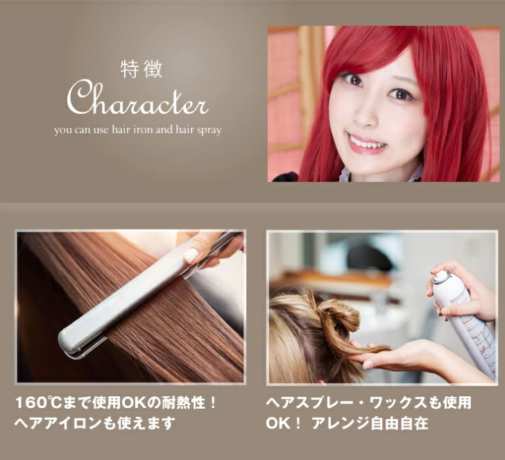 尚、このウィッグは耐熱性なので、160度以内の温度で「カーラー」や「ヘアーアイロン」を使用することが出来ます。