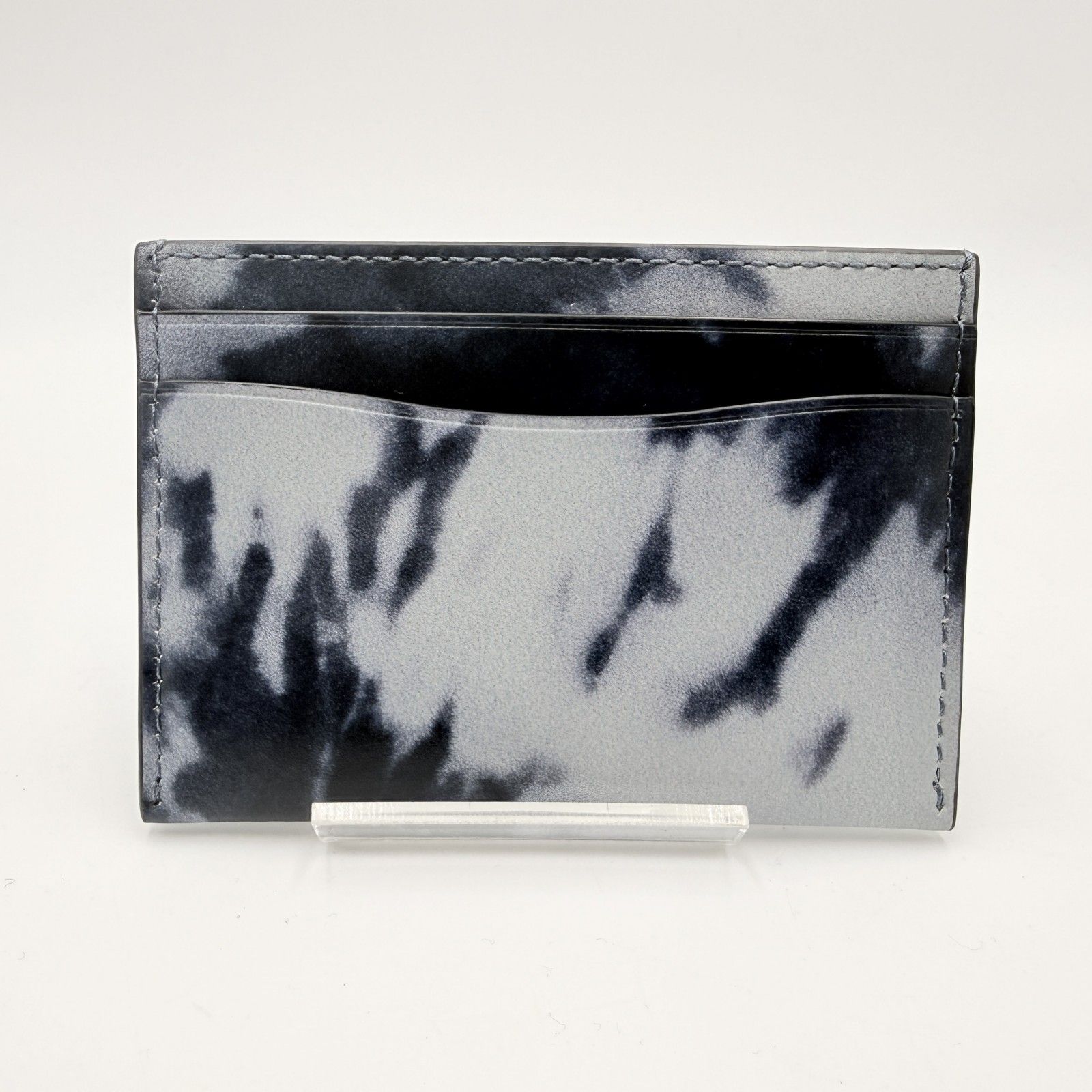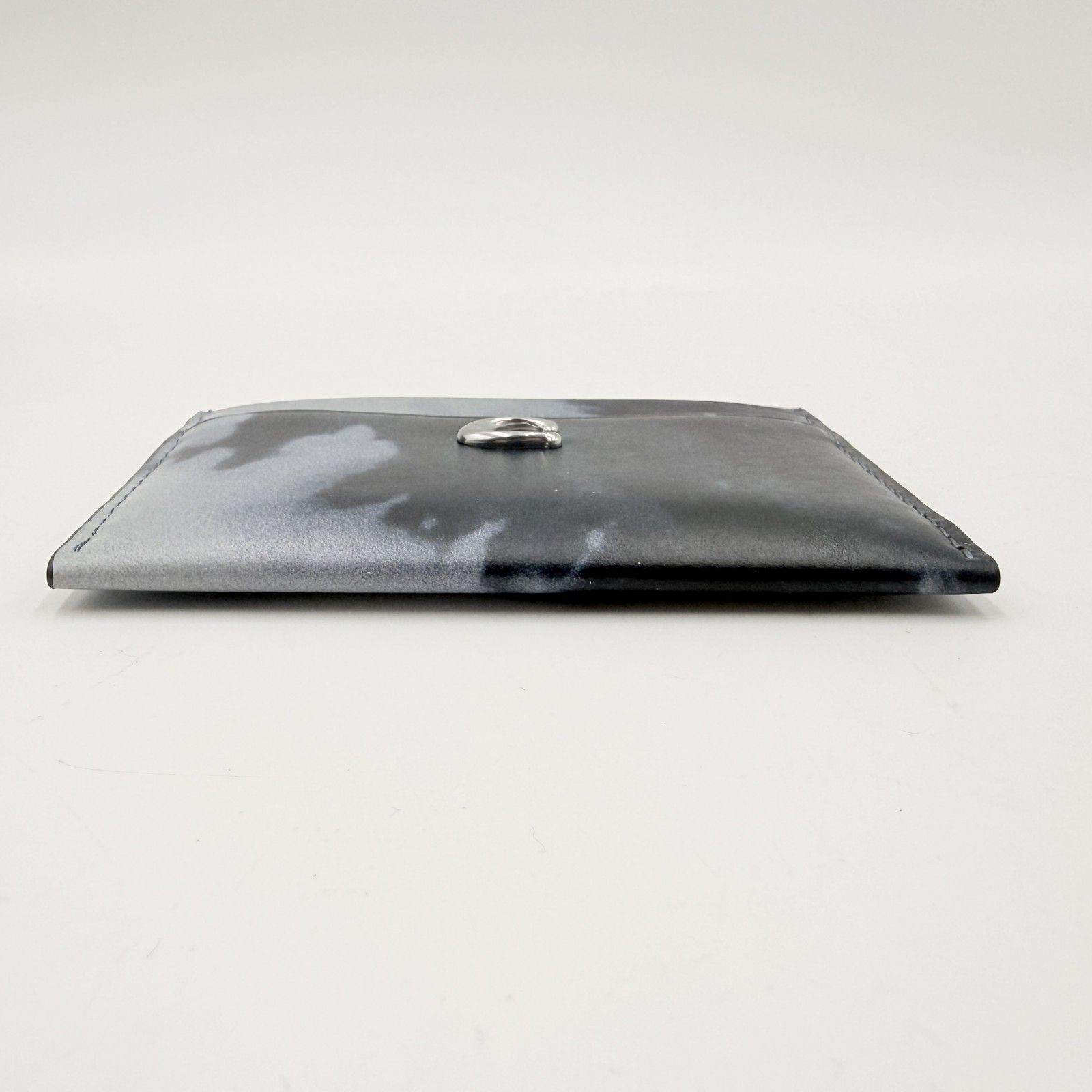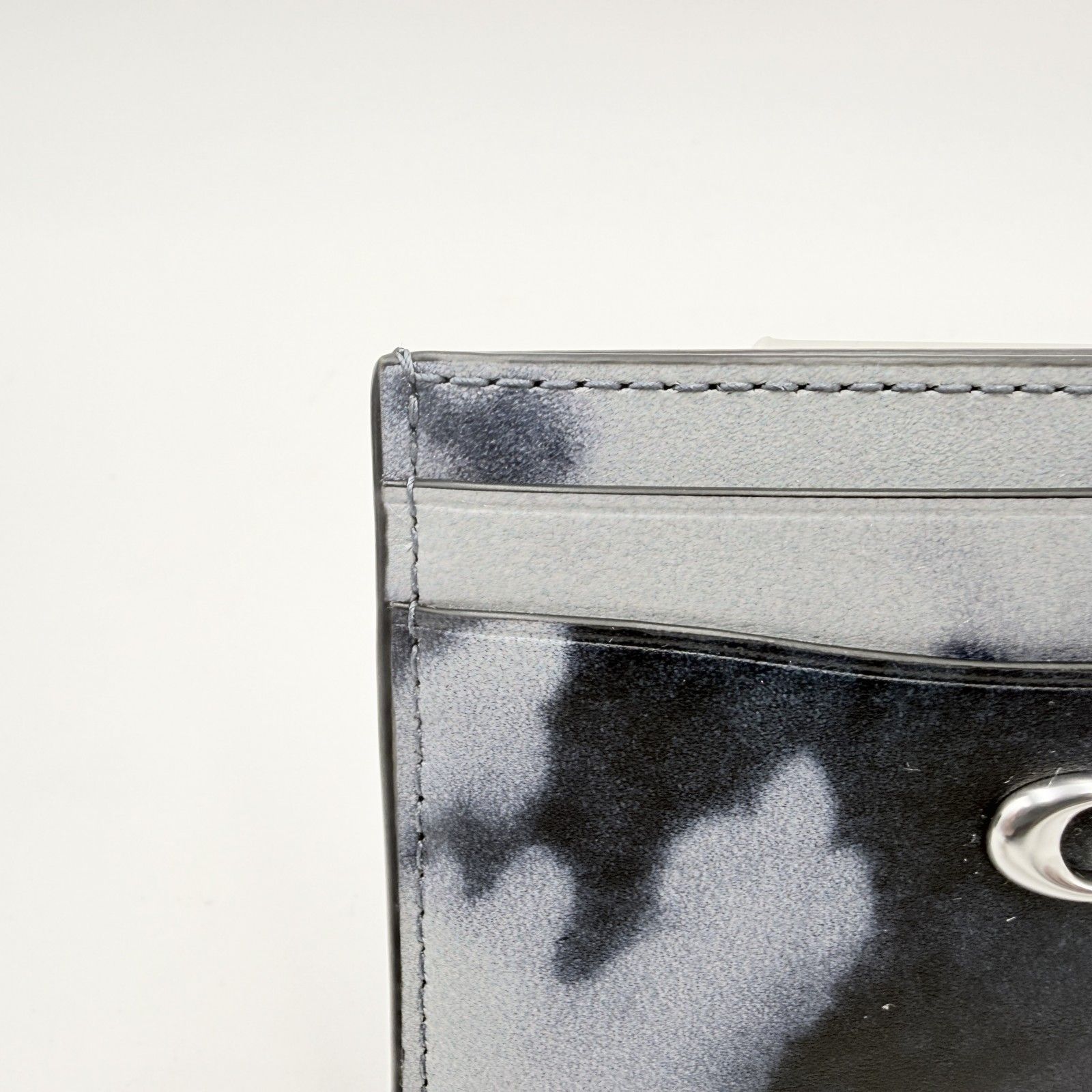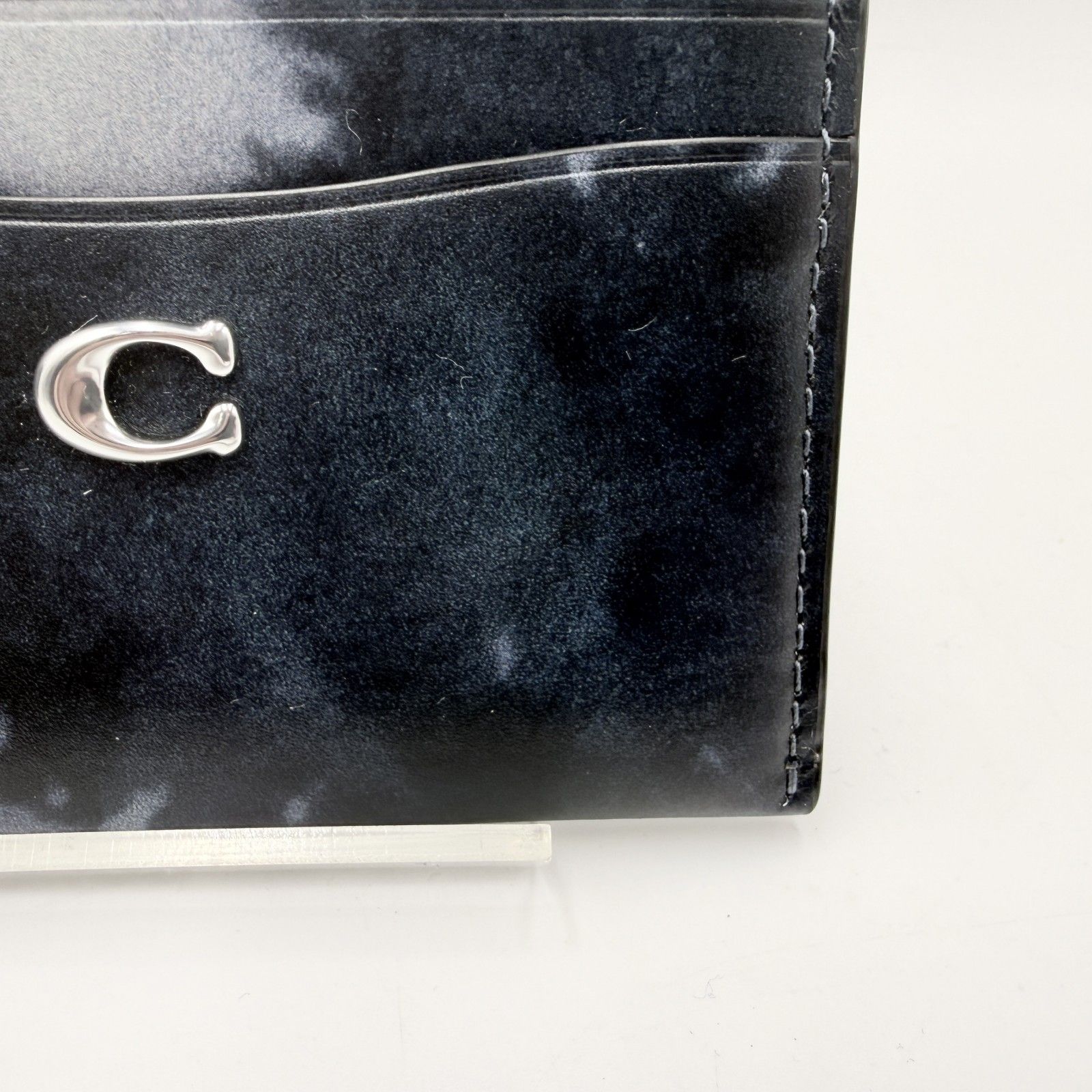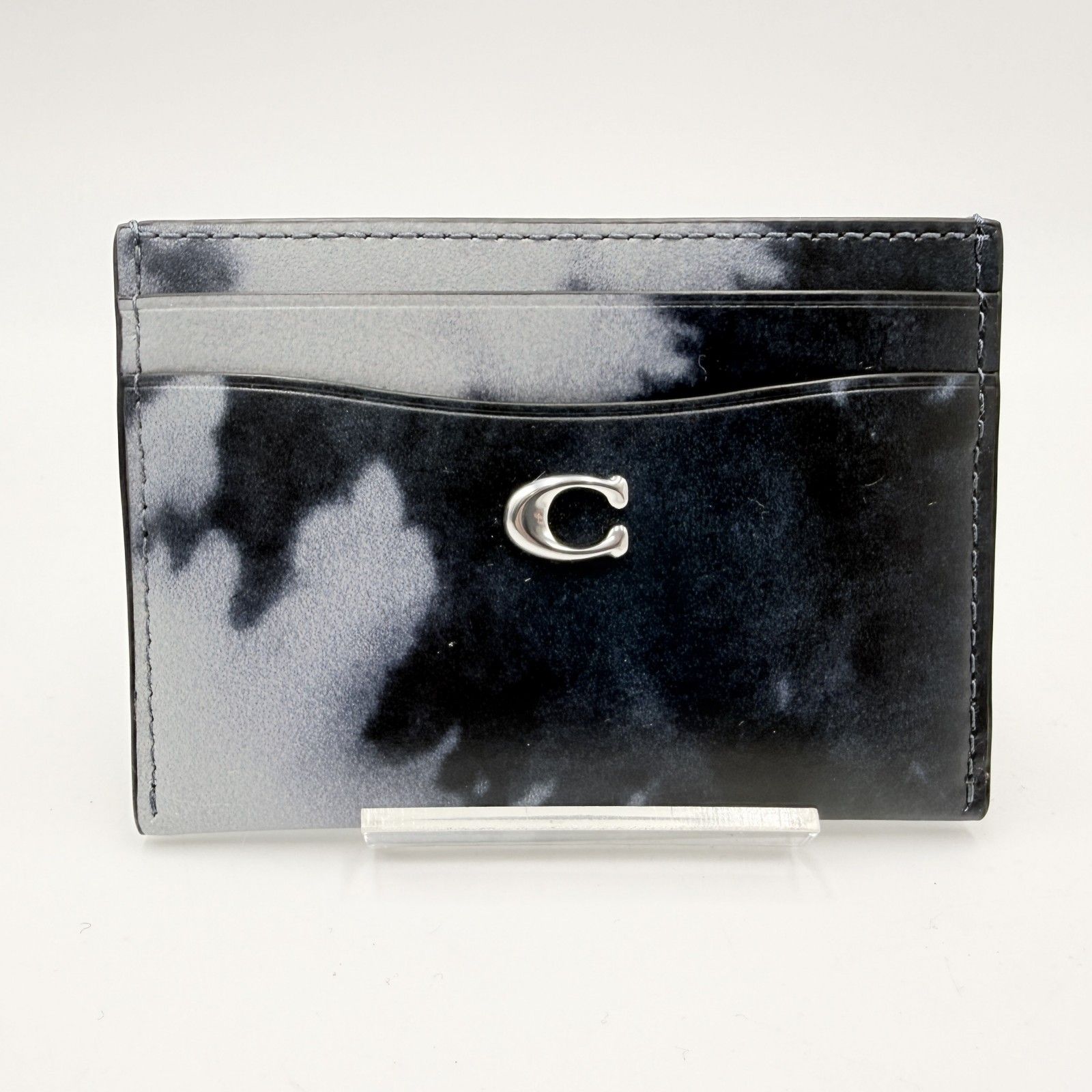 ブラック系のグラデーション調タイダイデザインに、フロントのCロゴ金具が配置されたデザインです。薄型のカードケースタイプで、バッグやポケットにも収まりやすいサイズ感です。