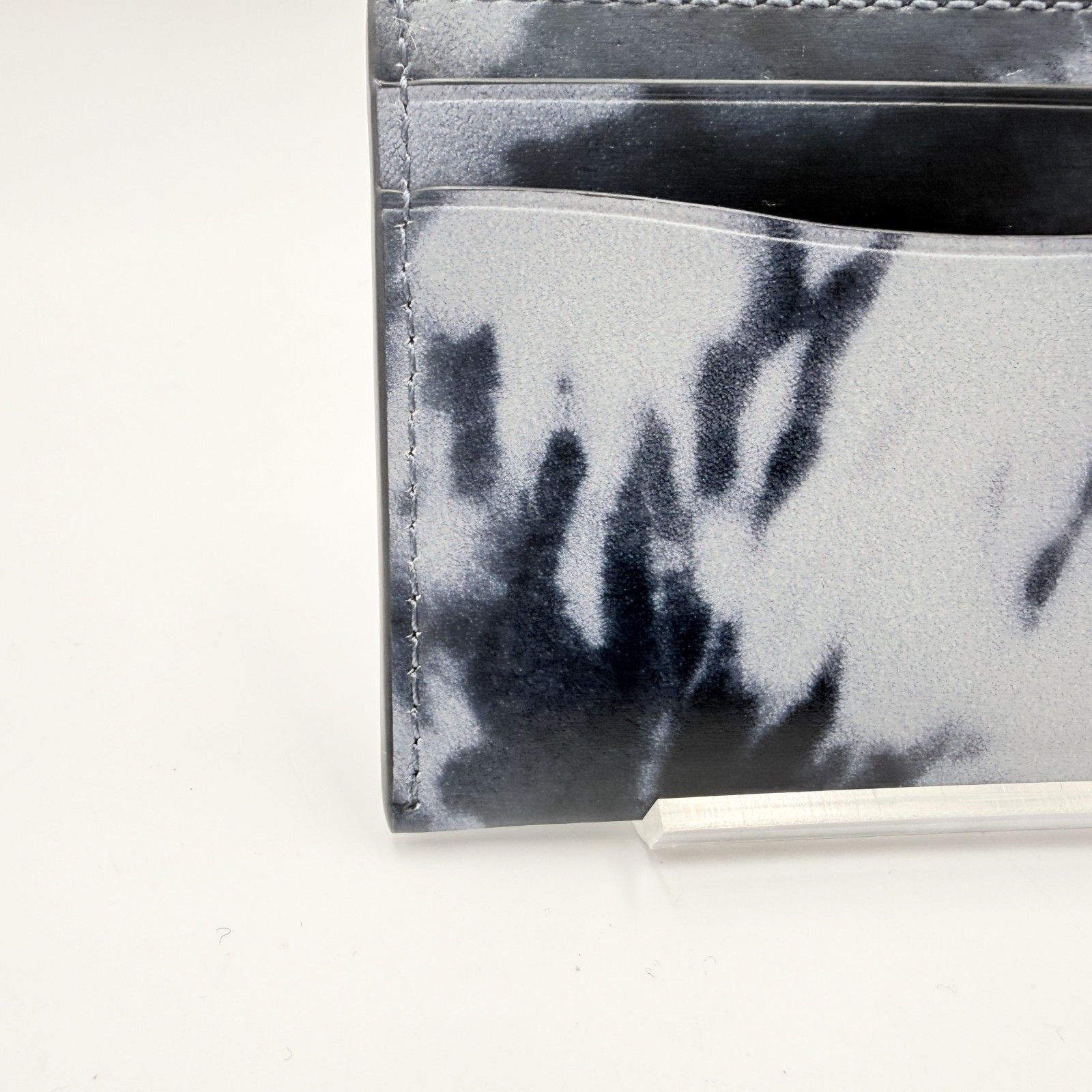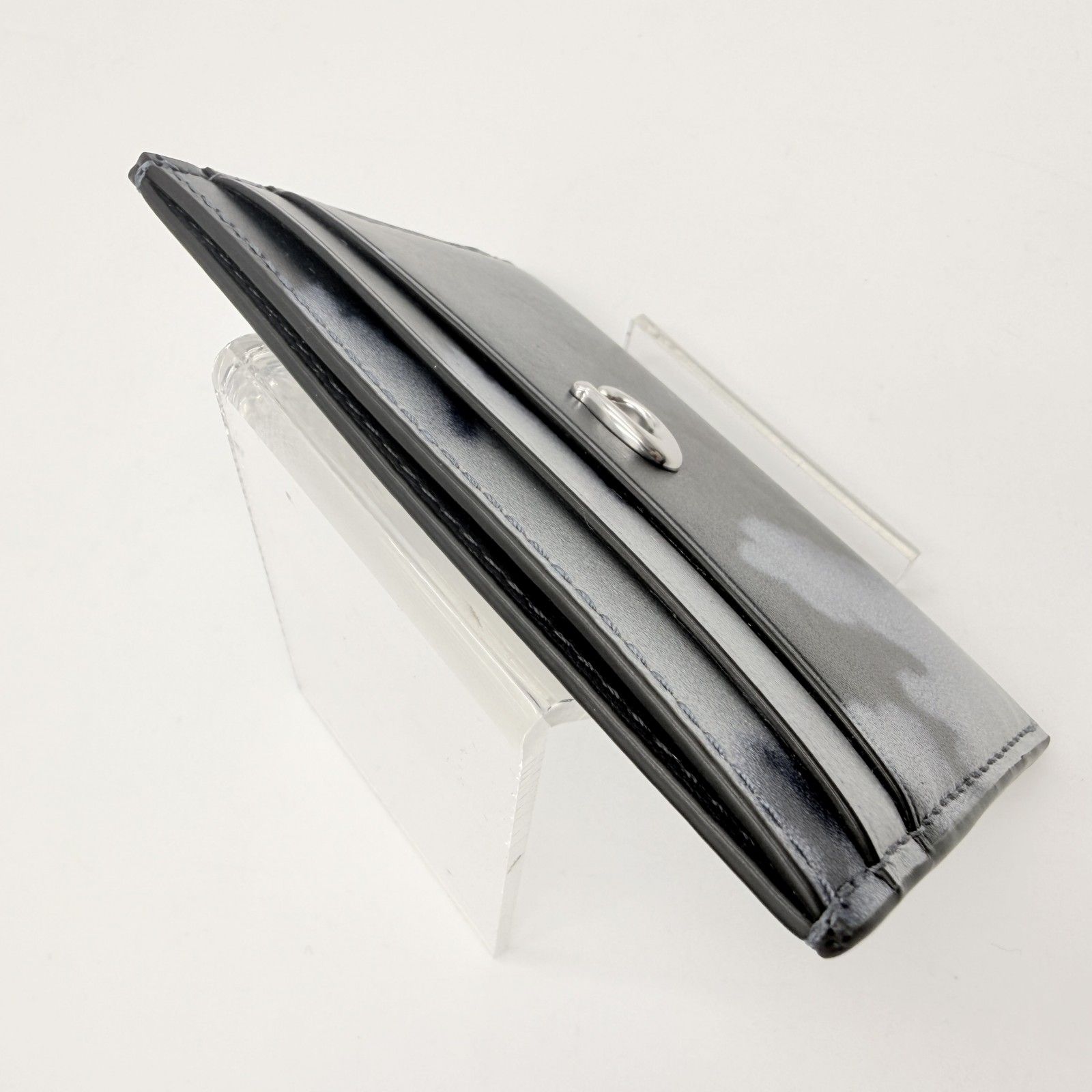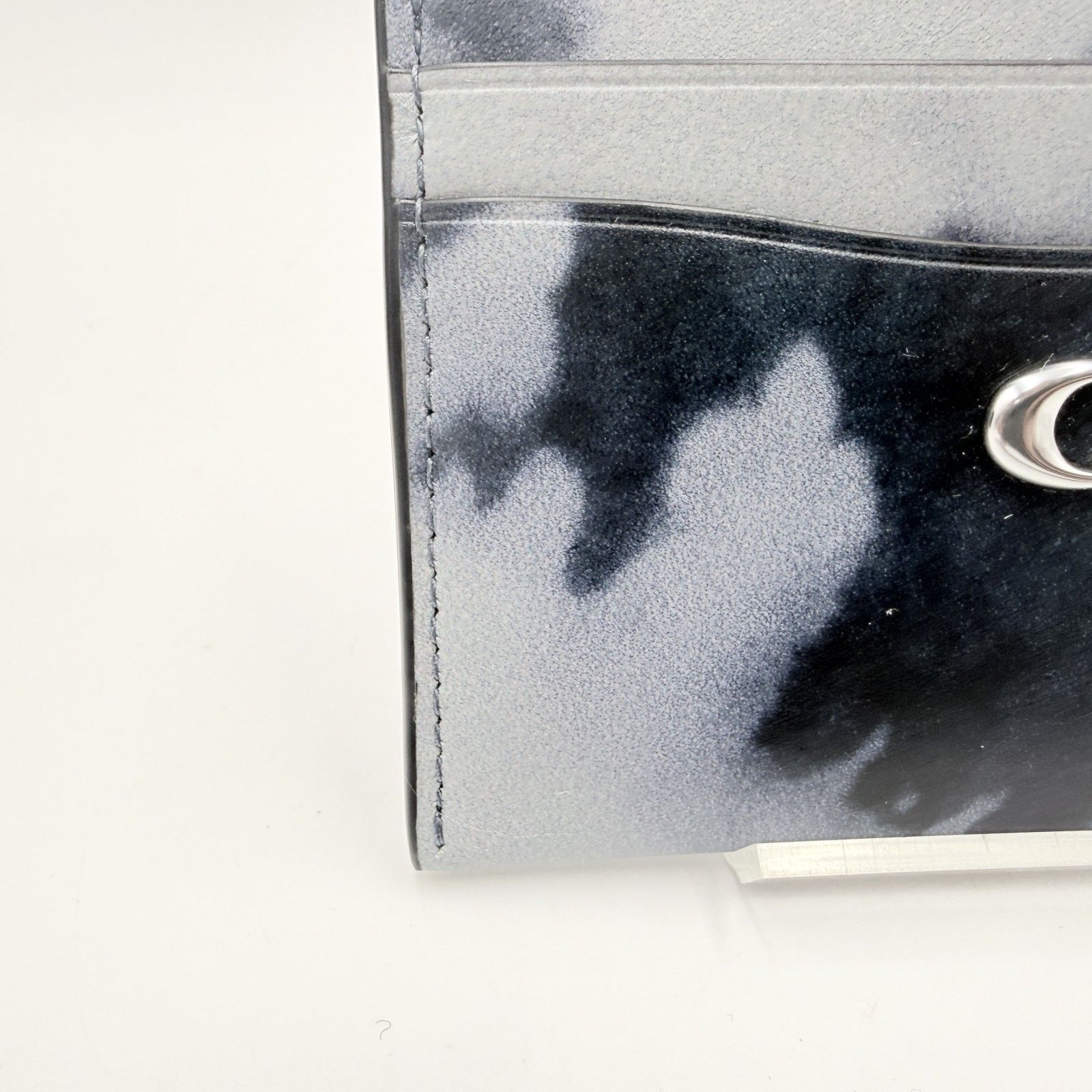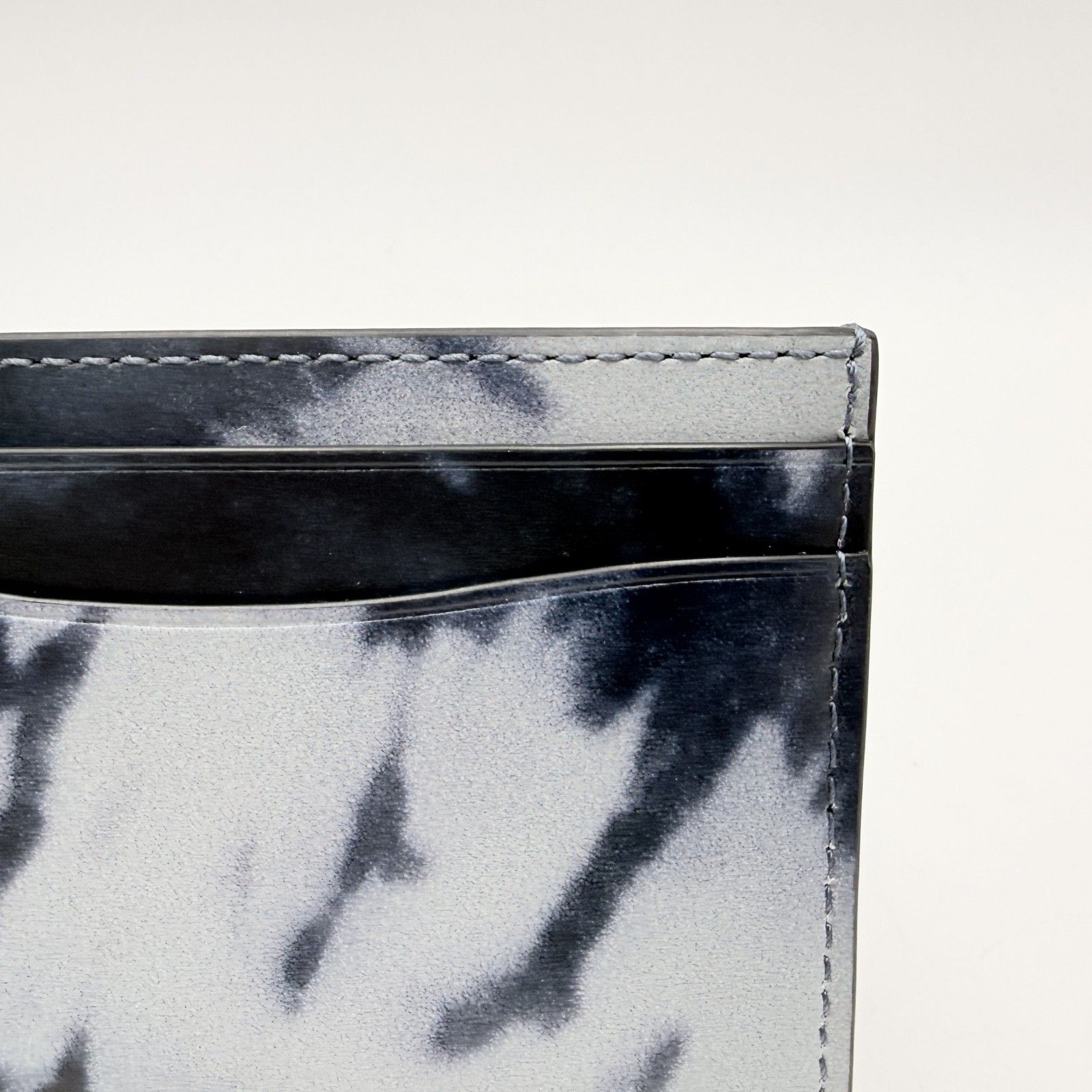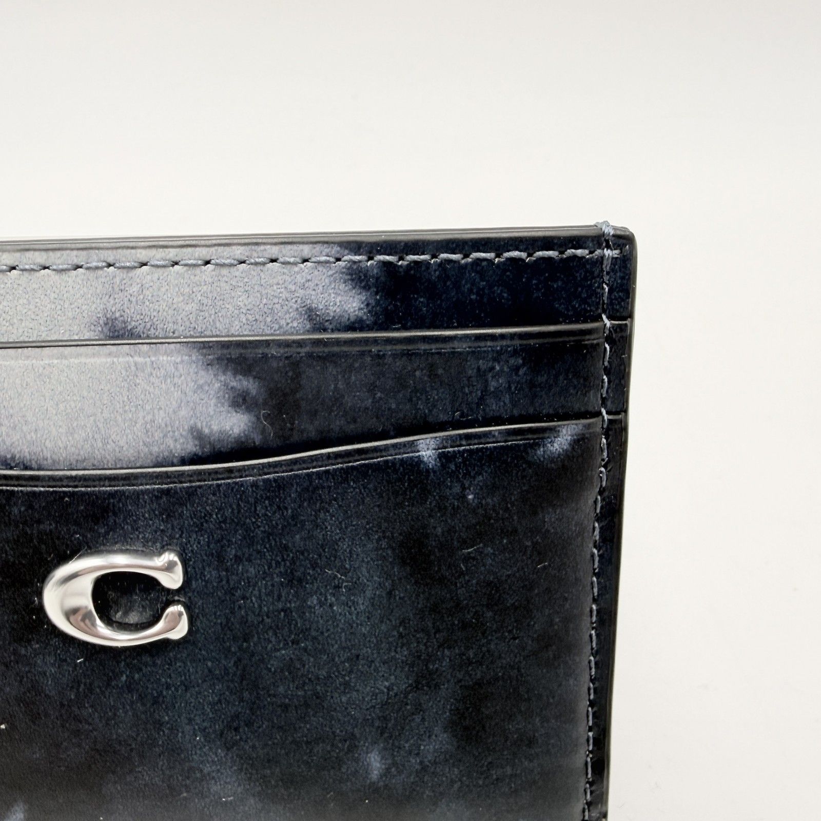 ブラック系のグラデーション調タイダイデザインに、フロントのCロゴ金具が配置されたデザインです。薄型のカードケースタイプで、バッグやポケットにも収まりやすいサイズ感です。