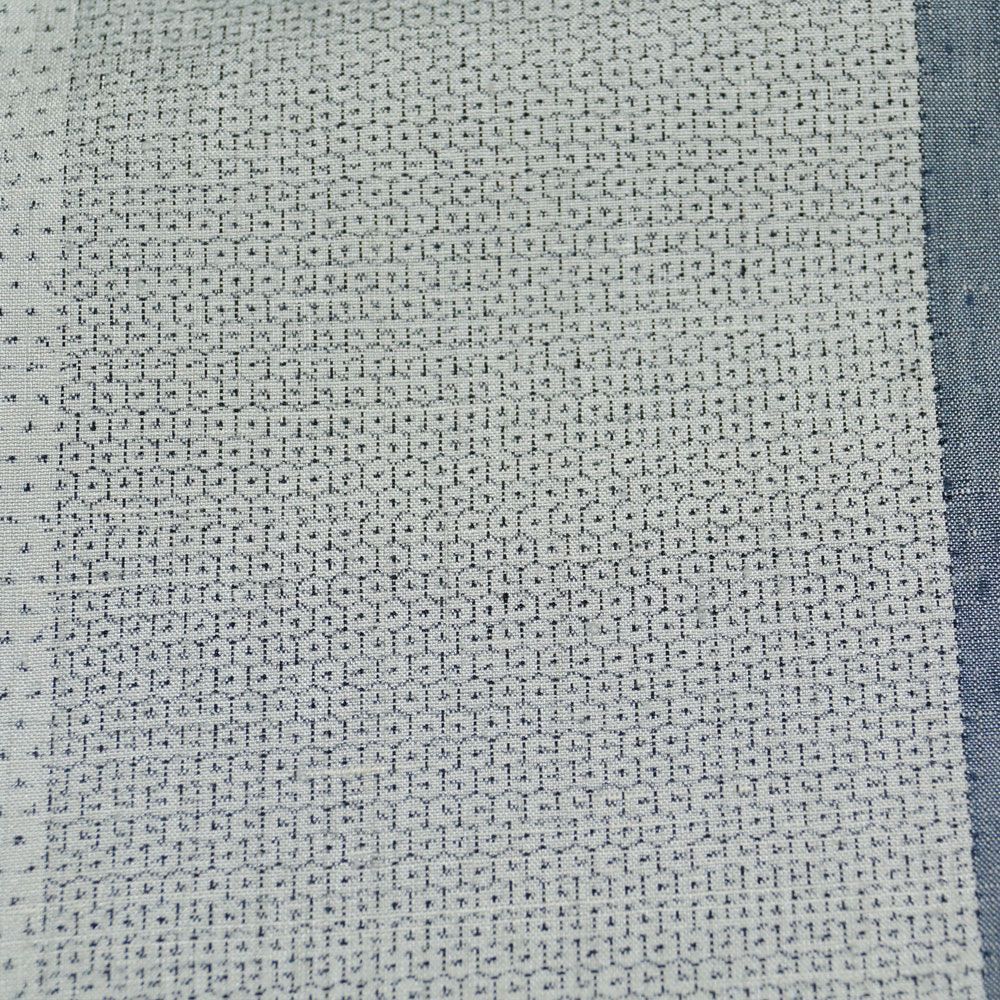 真綿の織節のある乳白色系の地に織り分けに亀甲や絣模様が織られた単衣の結城紬です。