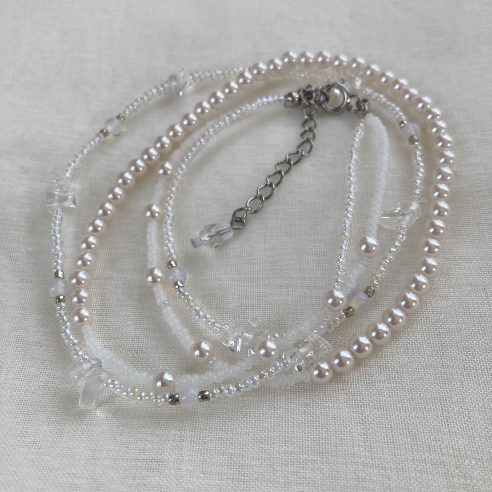 【素材】天然石オパール、水晶さざれ石、ガラスビーズ、パールビーズ、ビーズ、留め具(金具:国産)、ナイロンコートワイヤー