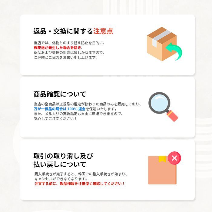 購入手続きが完了すると、韓国での輸入手続きが始まり、キャンセルができなくなります。注文する前に、製品情報を注意深く確認してください!👀