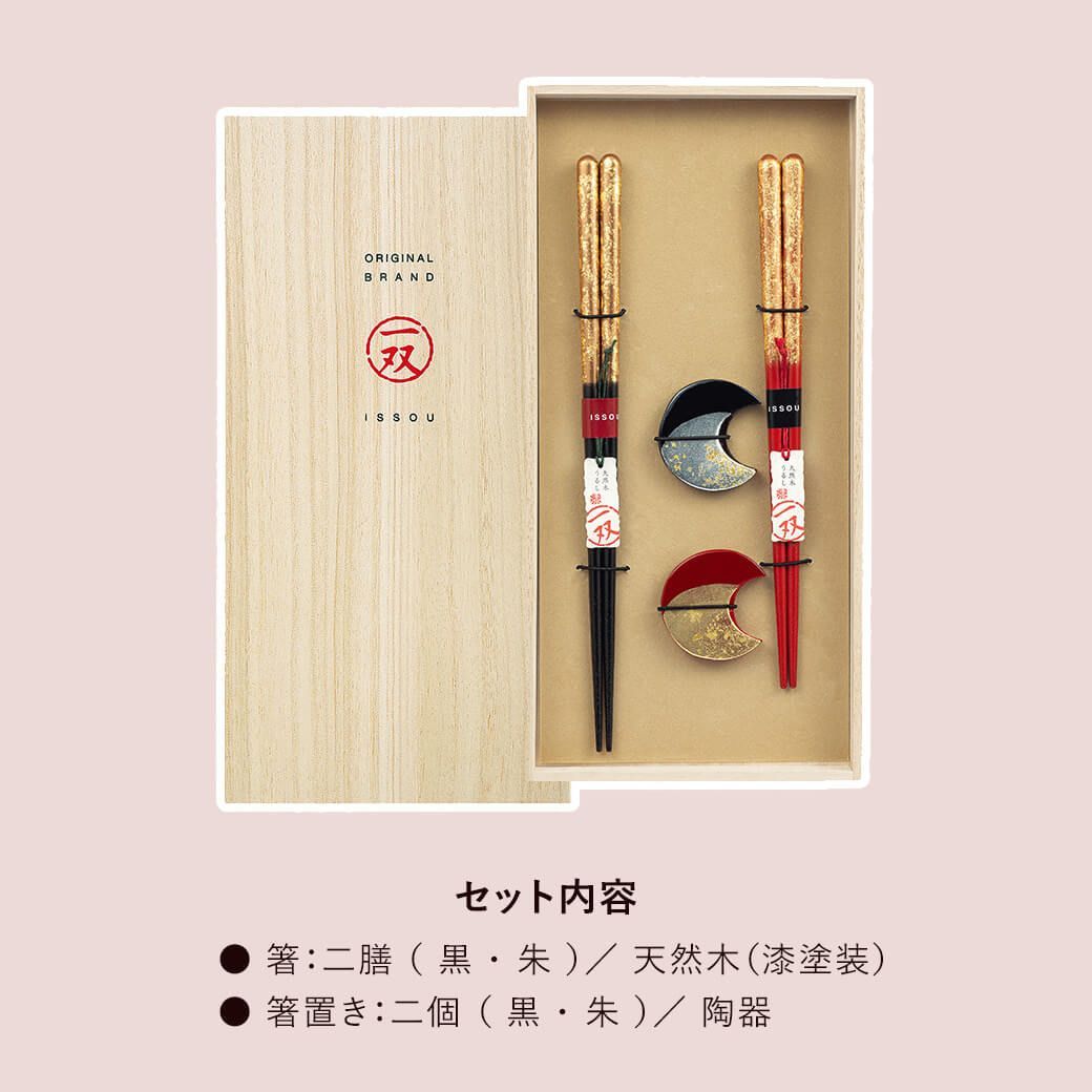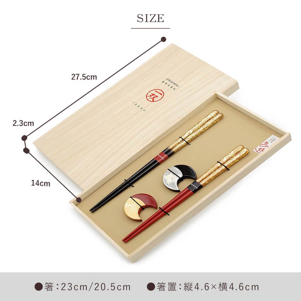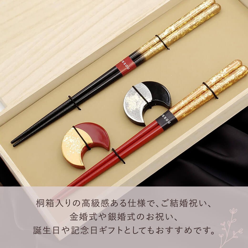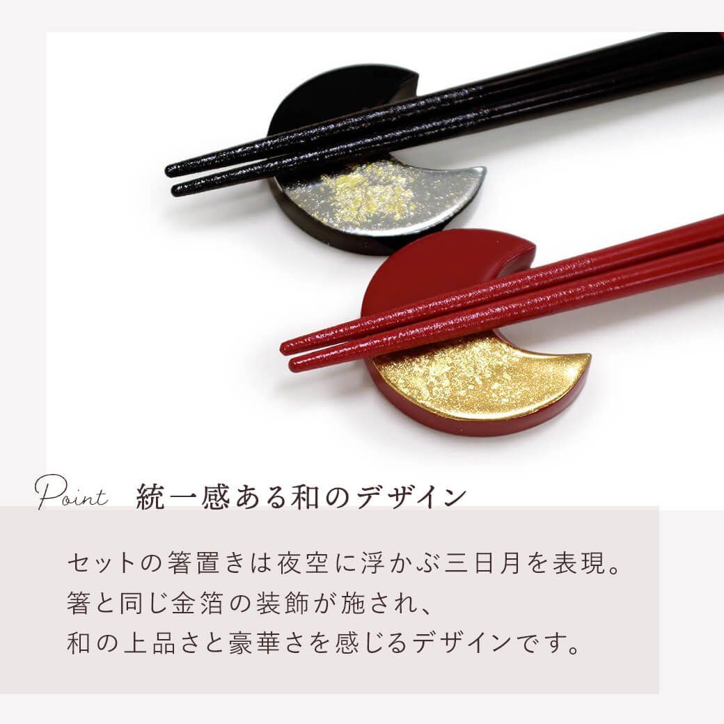 落ち着いた黒と華やかな朱赤の夫婦箸は、職人の手作業による繊細な仕上がりが特徴。夜空に浮かぶ三日月のような形の箸置きには、同じく金箔の装飾が施されており、統一感のある和の上品さと豪華さを演出します。