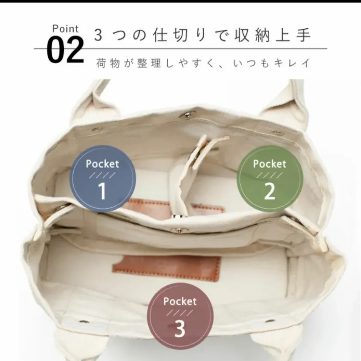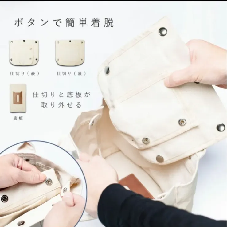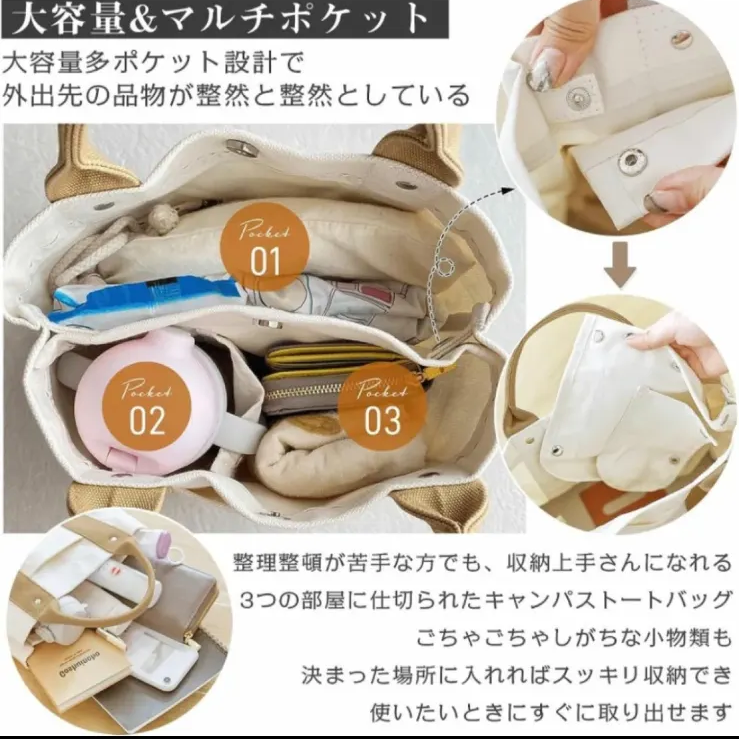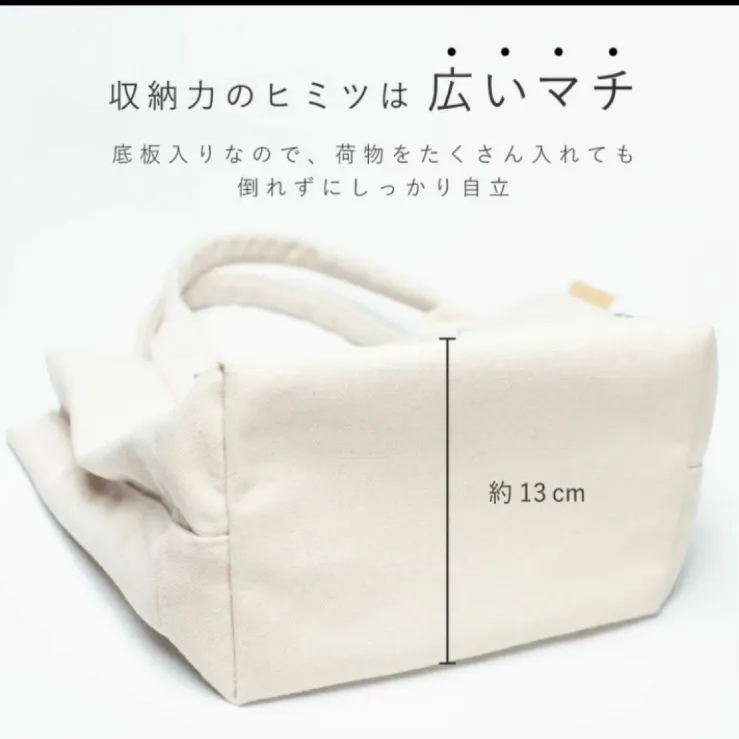 * 【ミニトートバックなのに収納力抜群!】: 3つの仕切りで中に何が入っているか一目でわかる!一番大きな収納スペースにはB5サイズが収納可能で普段使いにも、通勤バックにも使えます。お弁当など、かさばる荷物が多い日は仕切りを取り外して、普通のトートバックに変身。底板が入っているので沢山荷物を入れても安定して自立します。