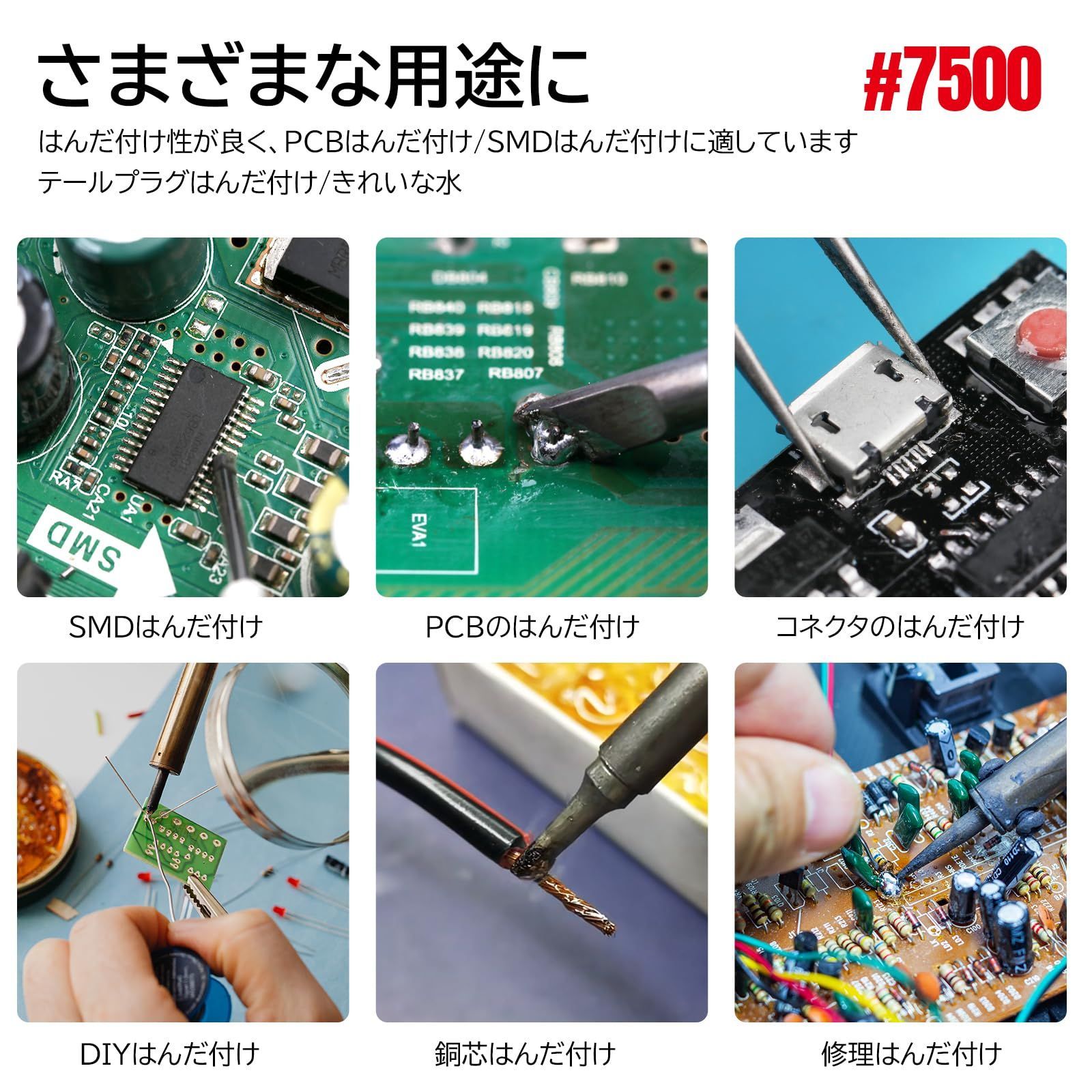 #7500 活性ロジンはんだ付けフラックスペーストの特徴: 鉛フリー/高速錫メッキ/酸化防止/優れた濡れ性/高い粘着力/高強度接合部/優れた絶縁性/優れたはんだ付け特性/滑らかな溶接面。