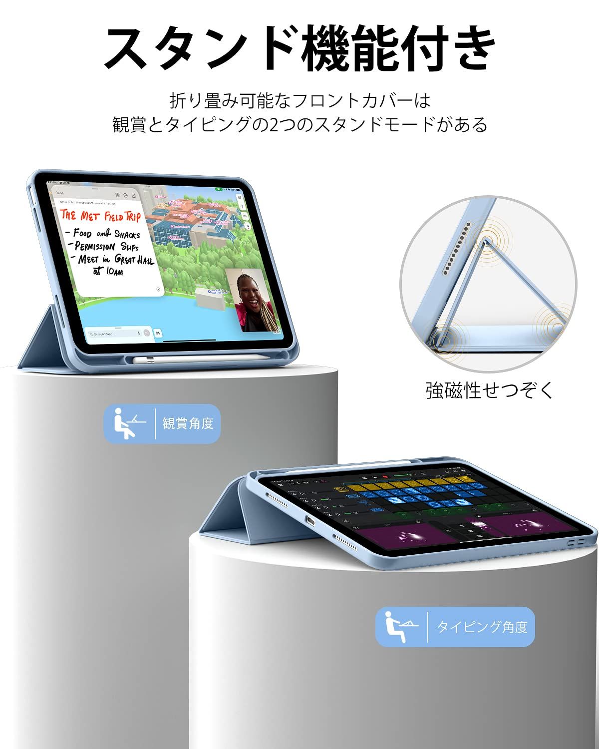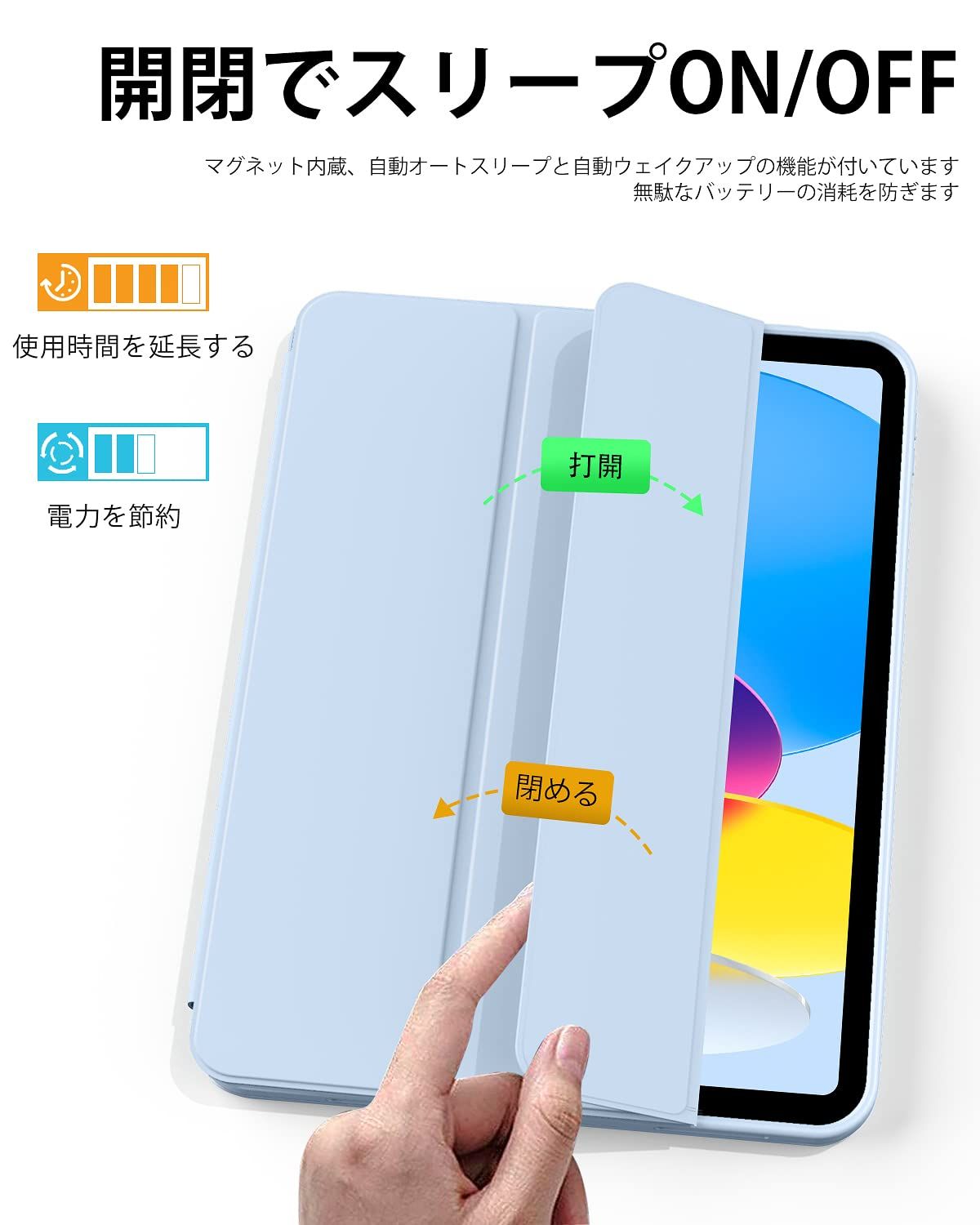 【オートスリープ/ウェイク機能】オートスリープ機能でカバーを開ける閉めることで電源自動的にオン・オフなります、使いやすく、省エネです。マグネット内蔵されているためカバンに入れてもカバーが勝手に開けることを心配必要なくしっかり閉められます。