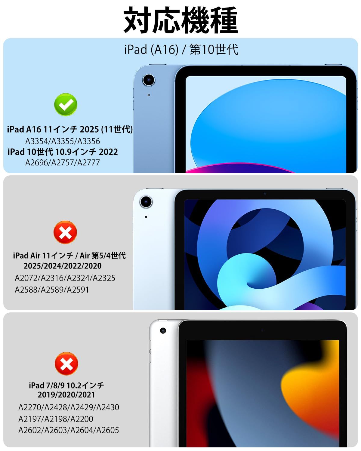 【対応機種】 iPad 11世代 (A16) 11インチ 2025、iPad 第10世代 10.9インチ 2022(モデル番号:A2696/A2757/A2777) 専用スマートケース。(ご注意:iPadの他のモデルには対応していません、ご注文の際に、 お手元機種の背面にあるモデル番号を確認をお願い致します。)