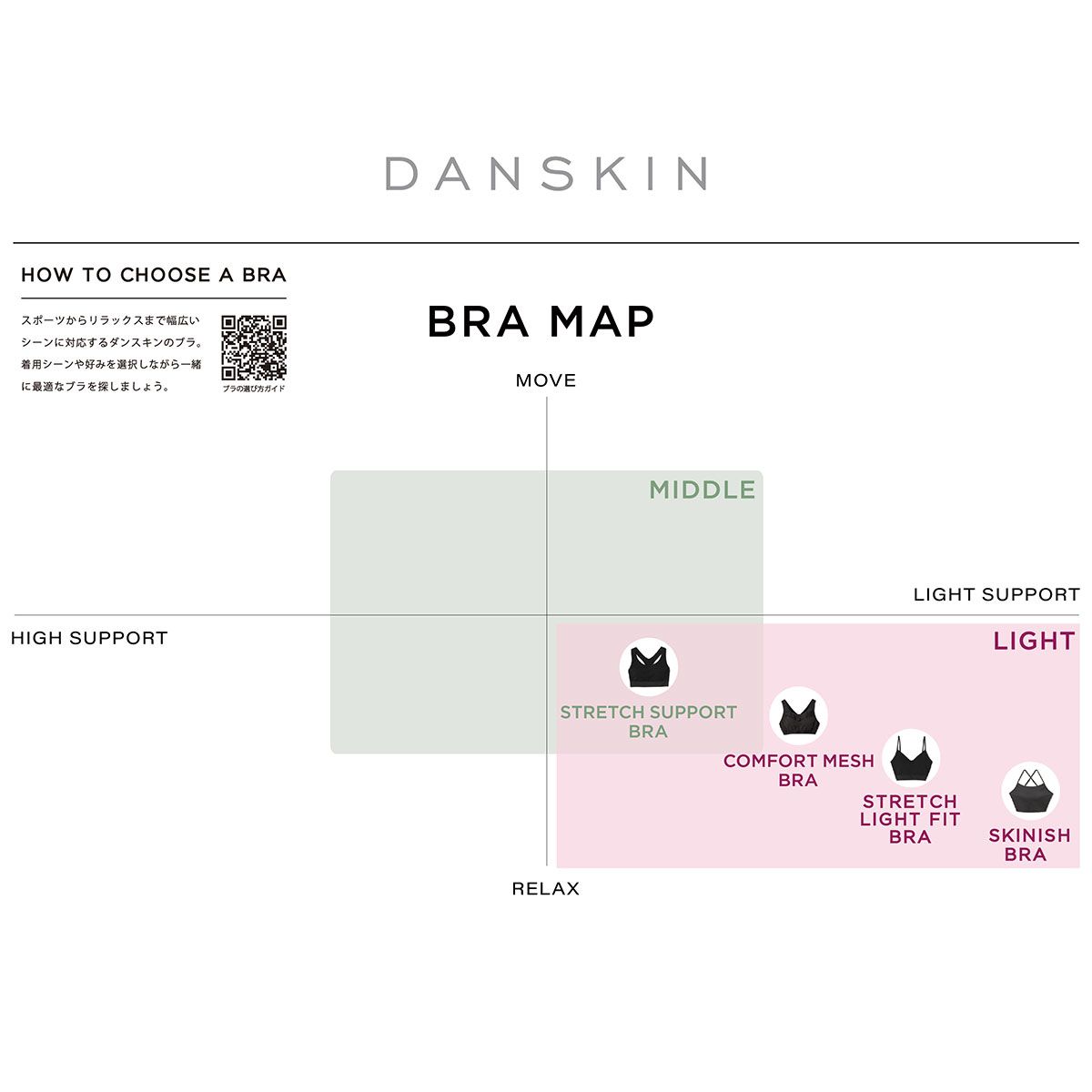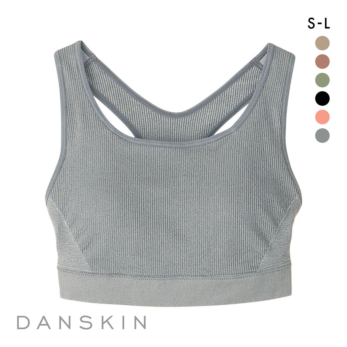 1882年にニューヨークで生まれたダンスキンは「FOR THE ATHLETIC WOMEN」をコンセプトに、アクティブで美しくありたい全ての女性のためのスポーツライフスタイルウエアを提案しています。締め付けすぎない着用感とバストの揺れを抑える機能を両立したミドルサポートブラです。素材は銀イオンによる抗菌防臭加工Polygiene(R)を施しており、ストレッチ性に優れ凹凸感のあるリブ編地をメインに使用。伸び防止メッシュを内蔵することで よりバストが揺れにくい仕様になっています。 着用時や洗濯でのカップのずれを軽減する縫込み式カップを採用しています。またサイドシームレスによりアタリが少ないため擦れが気になりにくく、背面はYバックで肩甲骨の動きを妨げにくい設計です。