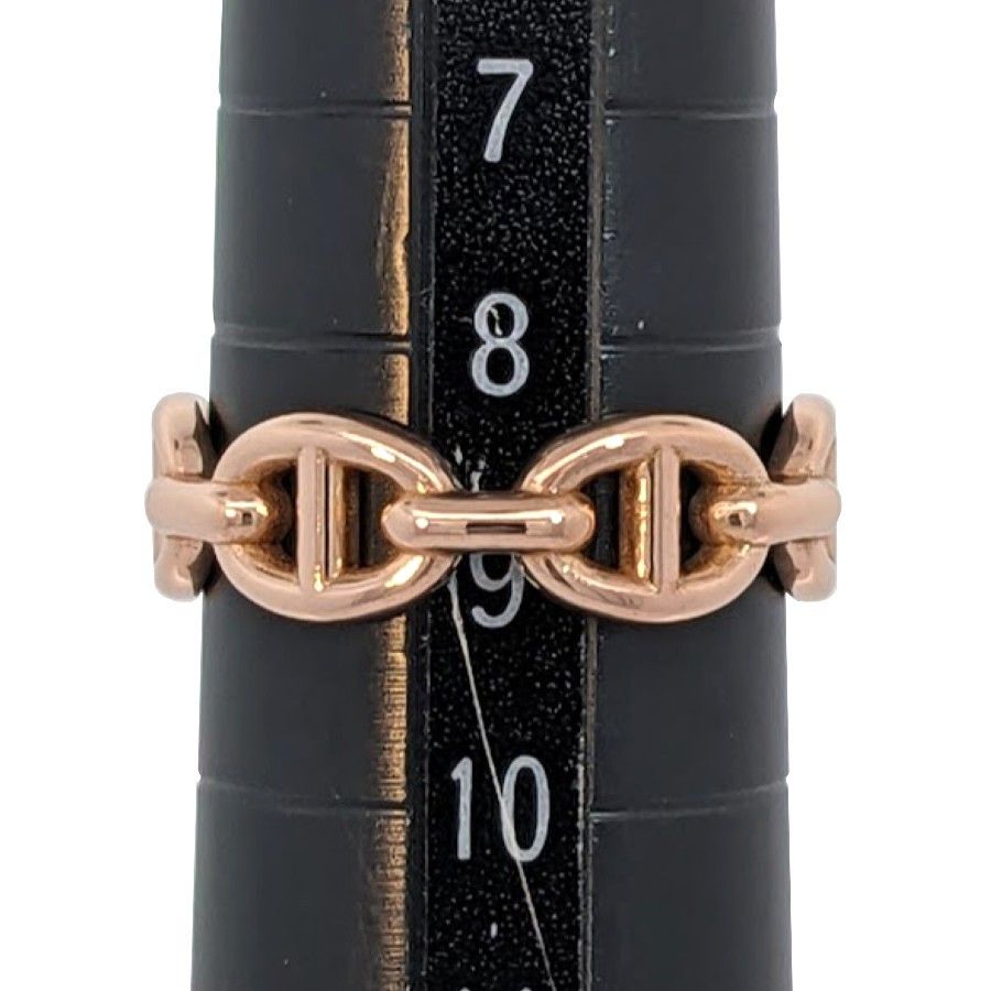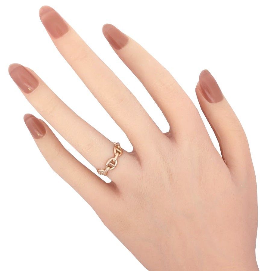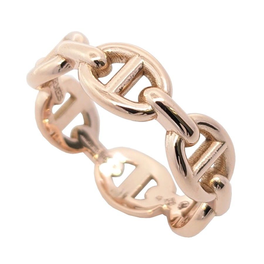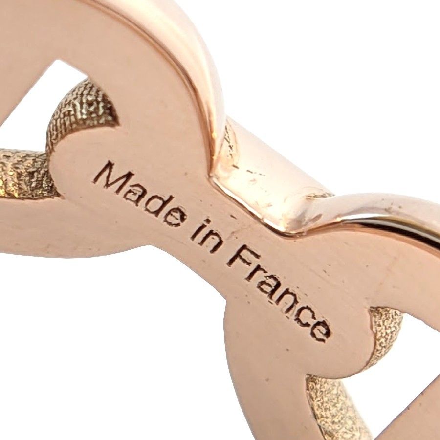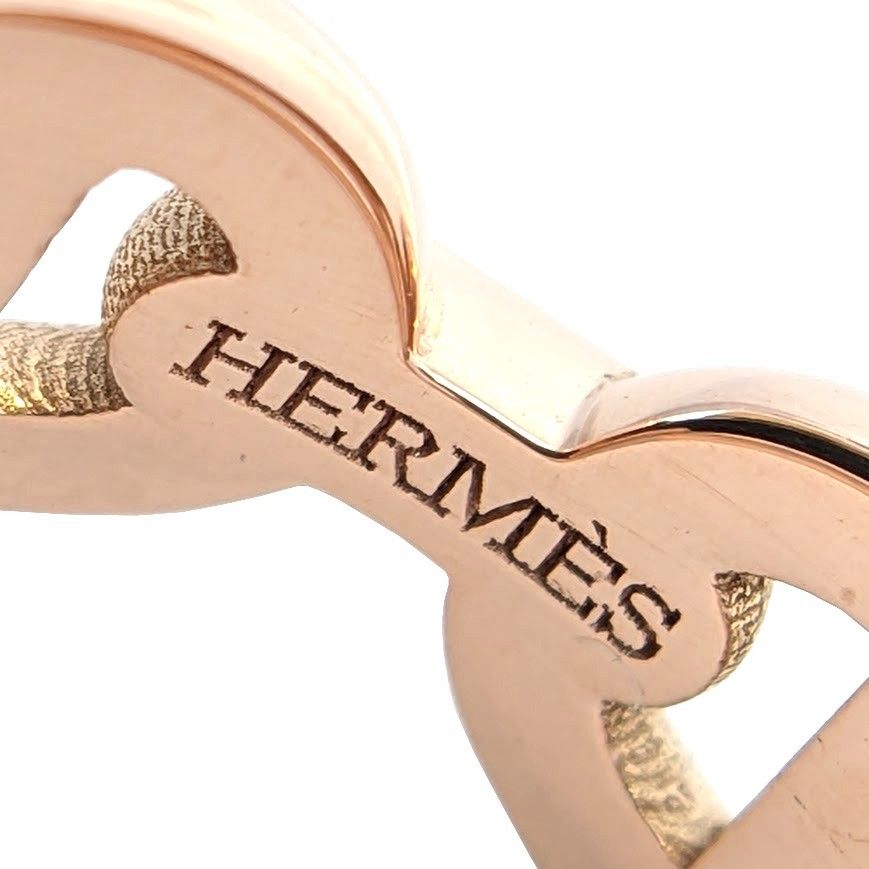 K18ピンクゴールドをあしらったリングです。1937年、ロベール・デュマはノルマンディの海岸を、船を眺めながら散策していました。船を岸につなぎとめる錨の鎖が視線を捉えたことをきっかけにして、エルメスを代表する《シェーヌ・ダンクル》が誕生しました。その「視線の知性」ともいうべきデザインは実用美にあふれており、この概念はエルメスの多くの作品に共通しています。