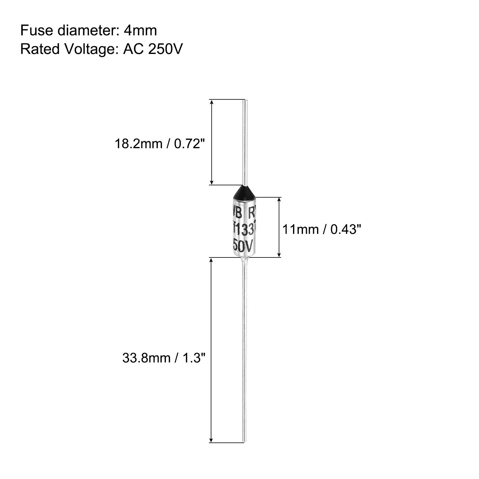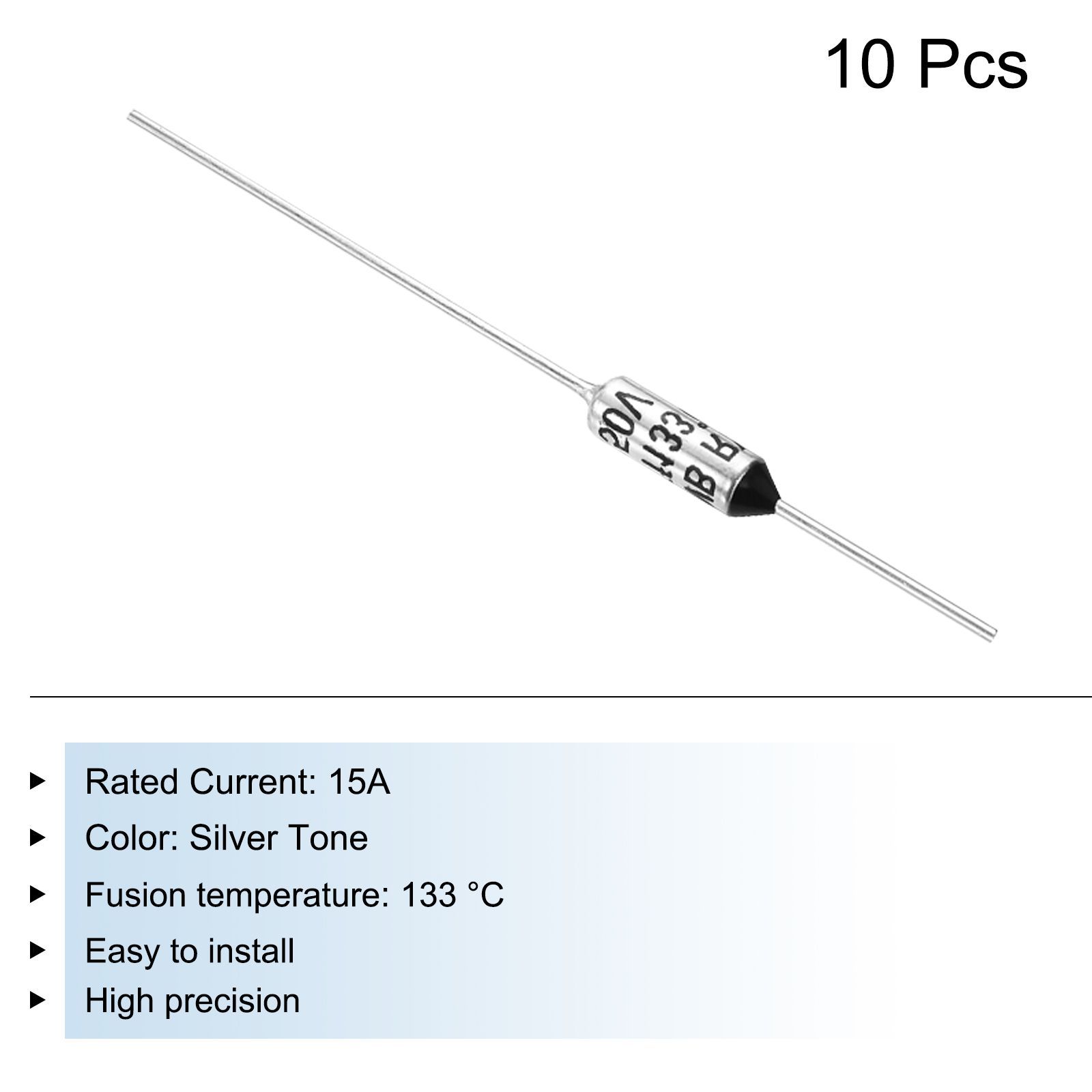 定格電圧:AC 250V;定格電流:15A;カラー:シルバートーン;ヒューズサイズ(直径×長さ):4x11mm/0.16x0.43インチ;定格溶断温度:133°C(271.4°F);パッケージに含まれるもの:金属温度サーマルヒューズ10個;