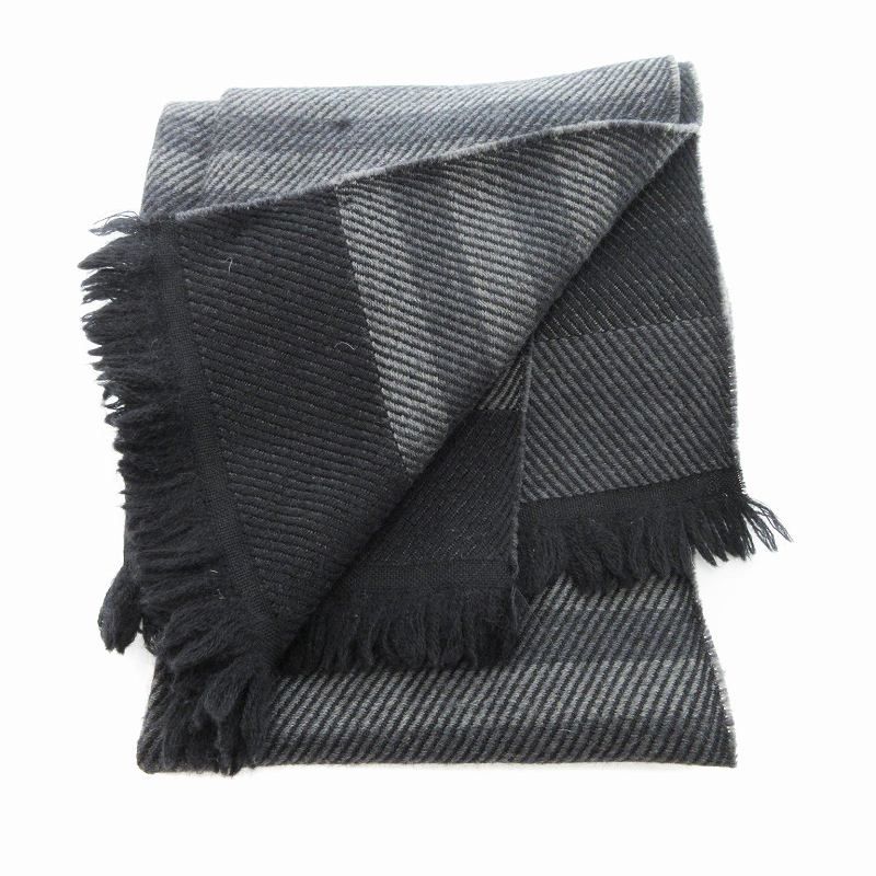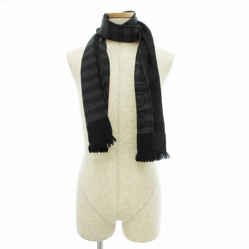 【商品名】ジョルジオアルマーニ GIORGIO ARMANI マフラー ボーダー ロゴ ウール フリンジ 黒 グレー /JS ■GY99