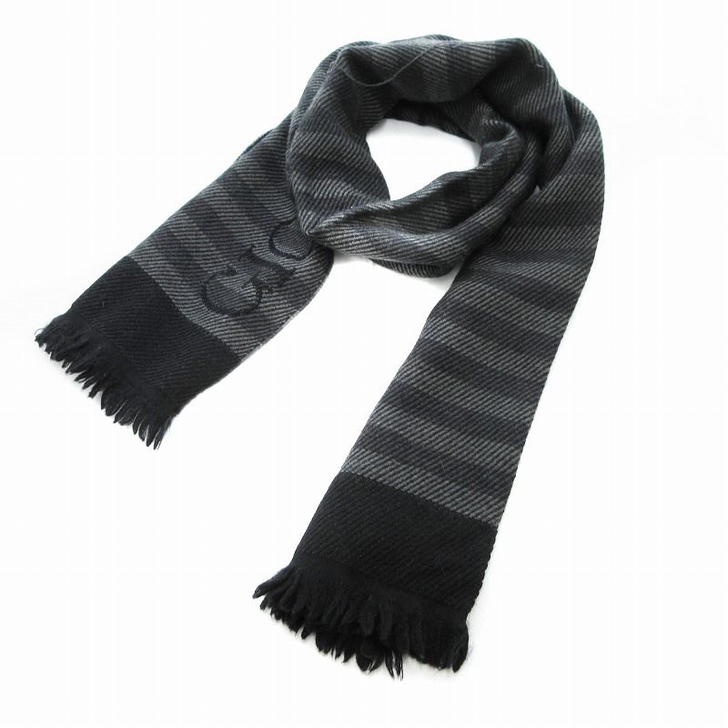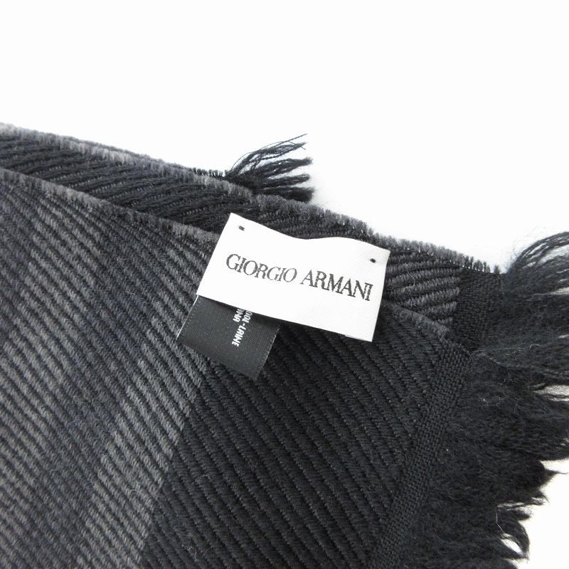 ジョルジオアルマーニ GIORGIO ARMANI マフラー ボーダー ロゴ ウール フリンジ 黒 グレー /JS ■GY99
