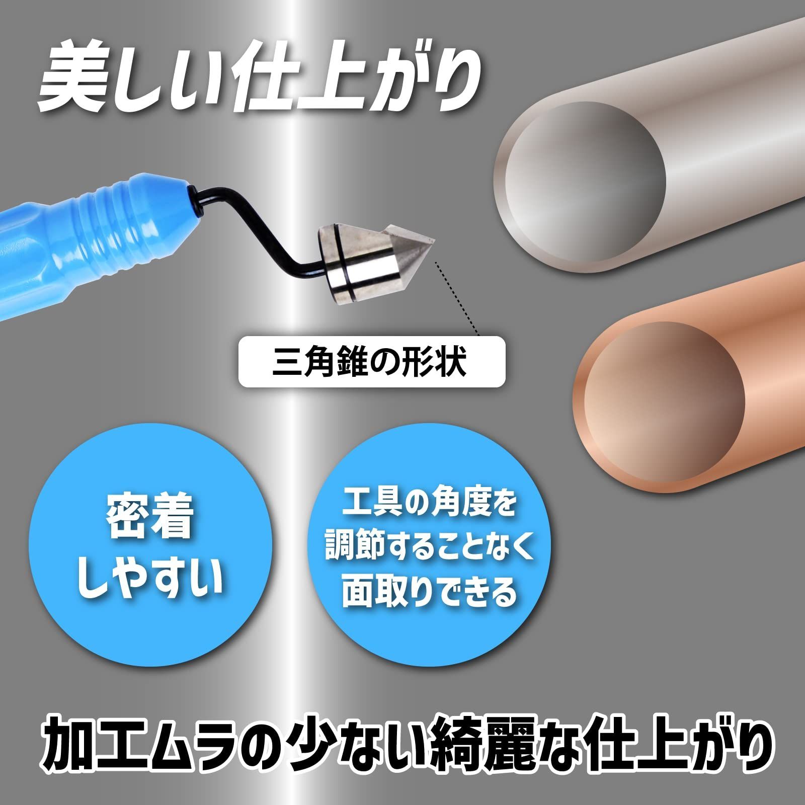 美しい仕上がり:リーマーの削る部分は密着しやすい三角錐の形状をしており、工具の角度を調節することなく面取りを行えます。一定の速度と力を保って回転することで加工ムラの少ない綺麗な仕上がりを目指せます。