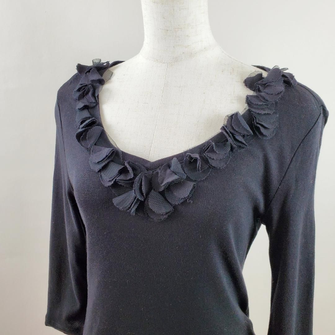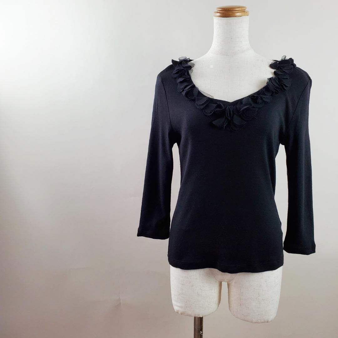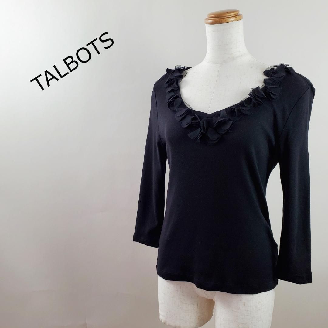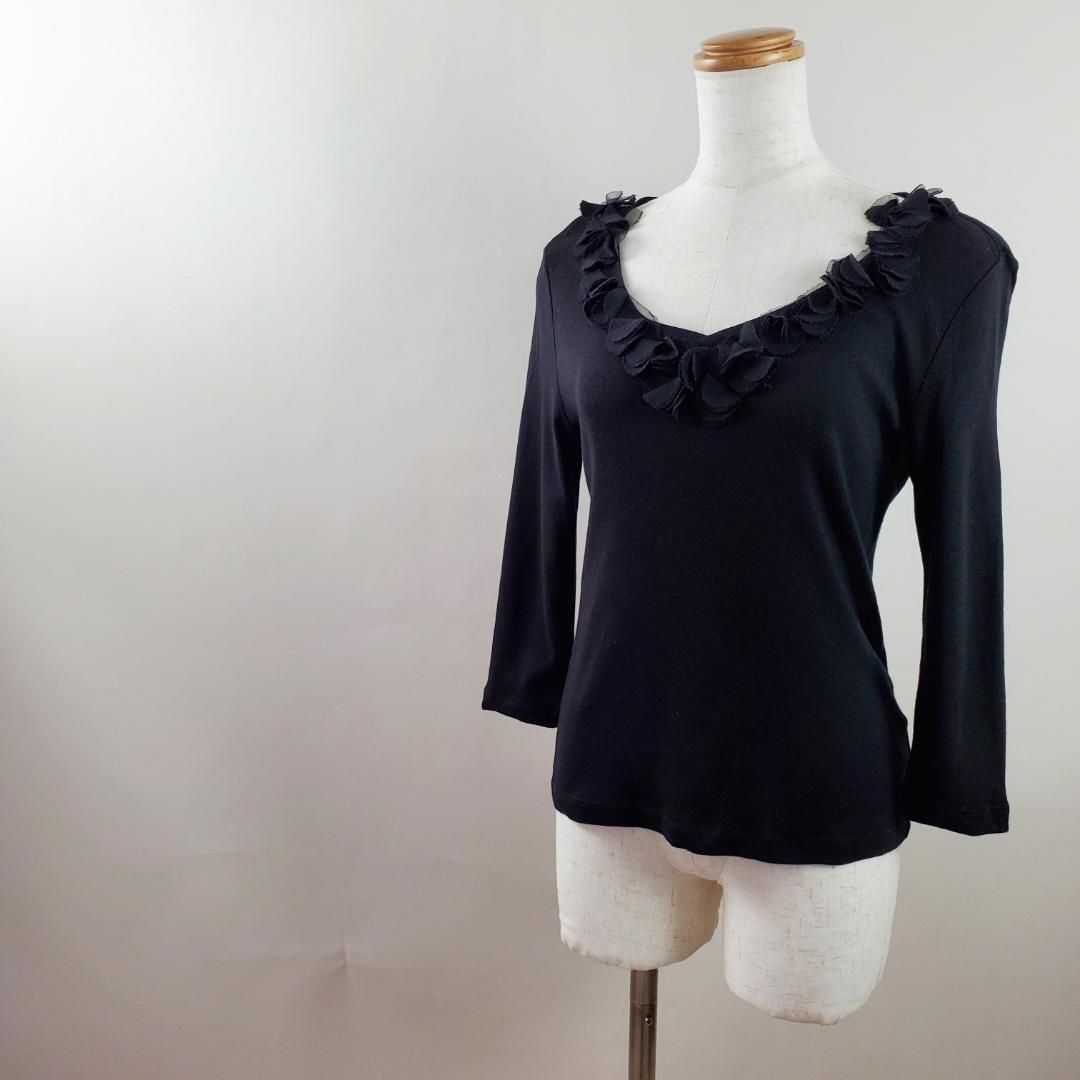 【レースフリルネック】タルボット オーバルネック 七分袖 フリルカットソー 黒 ブラック M相当