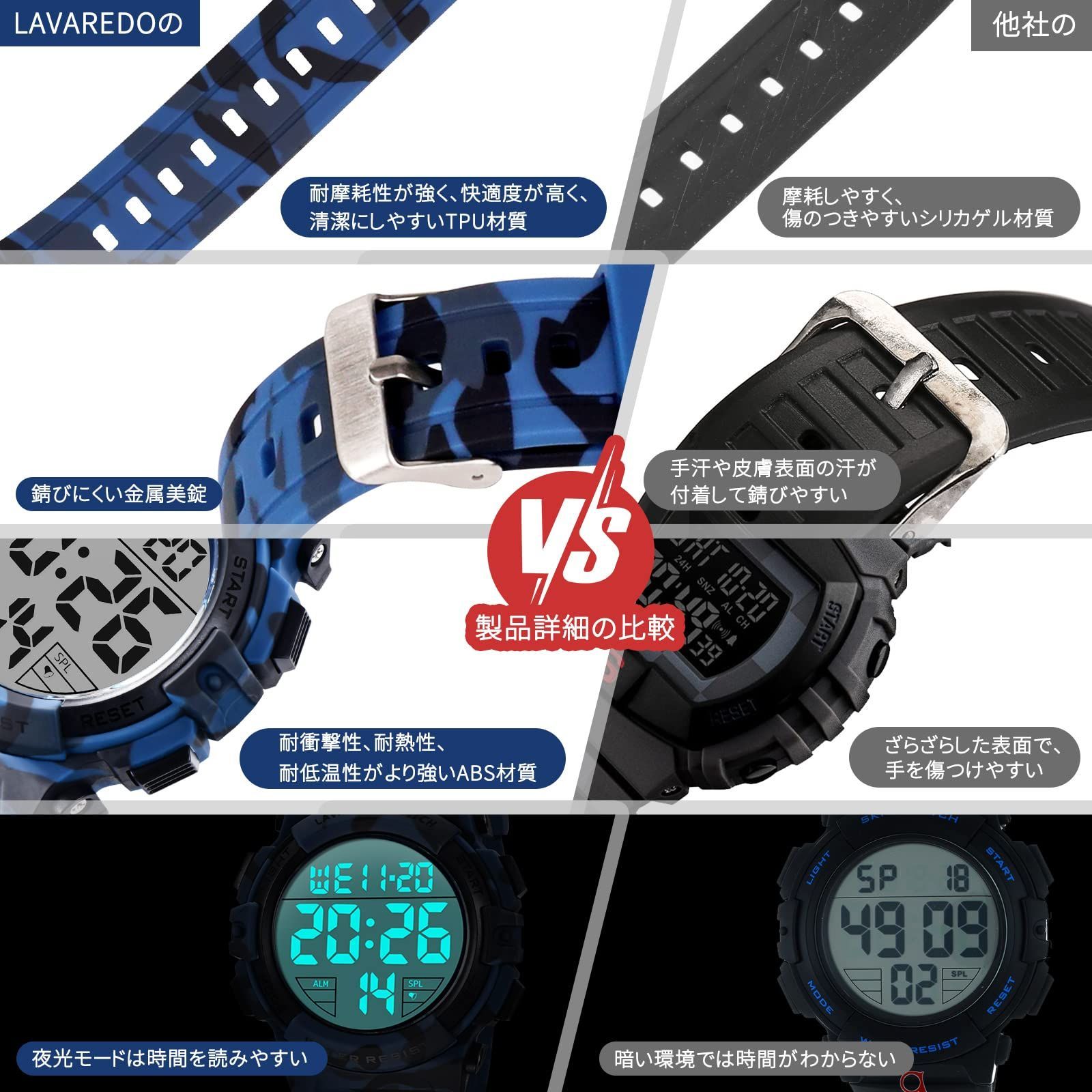 [多機能付き デジタル腕時計]多機能なデザインと高品質PU素材を採用しており、デジタル表示、LEDバックライト、日付、曜日、アラーム、ストップウォッチの機能が含まれて、日常使いに最適。5ATM日常防水、耐衝撃性と耐久性があり、耐用年数が長い。