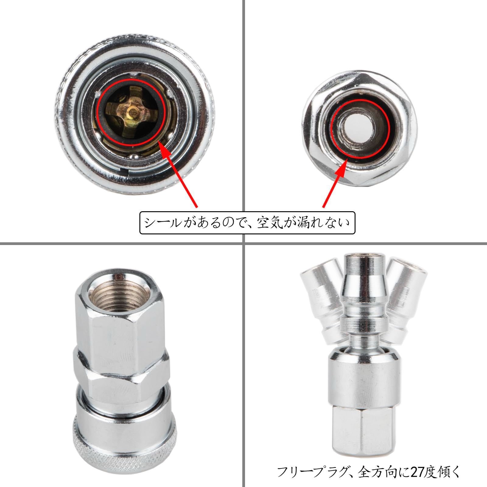 フリープラグ:先端のプラグが全方向に27°傾く画期的な商品です。(全角55°傾きます。)作業時のホースの追従を軽減し、手首の疲労や腕・肩への負担が軽減できます。