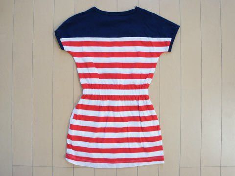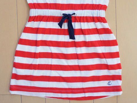 数回着用程度の綺麗な印象のお品。綿100%のカットソー素材。Tシャツ地程度の素材。お色は紺・赤・白のトリコロール。全体に少々毛羽立ち感あり。身幅胸の辺りで約30cm、着丈約57cm。(株)プチバトージャパン製。サイズ表示5歳108cmとなっています。ウエスト部分は紐で絞ることが可能。着丈がやや短めのためレギンスやスパッツなどとチュニック風に着用するとかわいいデザインだと思います。