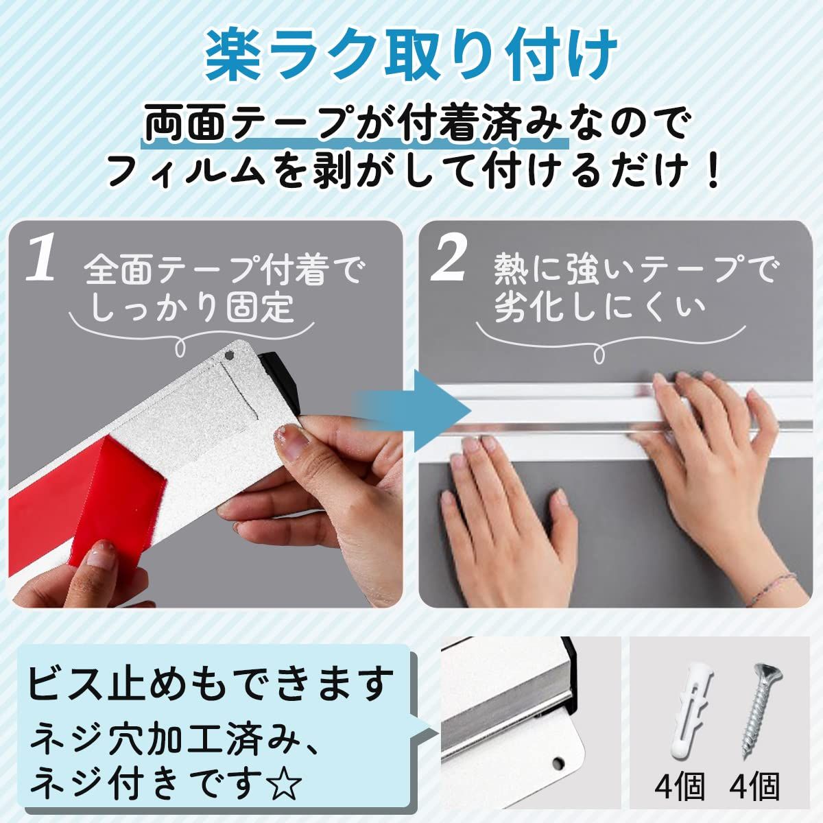 【穴あけ不要の両面テープ式】あらかじめ両面テープが付着されており、フィルムを剥がしてそのまま簡単設置できます。熱に強いタイプのテープなので、厨房などでも安心して設置できます。又、一面にテープを付着していますのでより密着力が高いです。ネジでビス止めも出来るよう、ネジもセットでお付けしています。