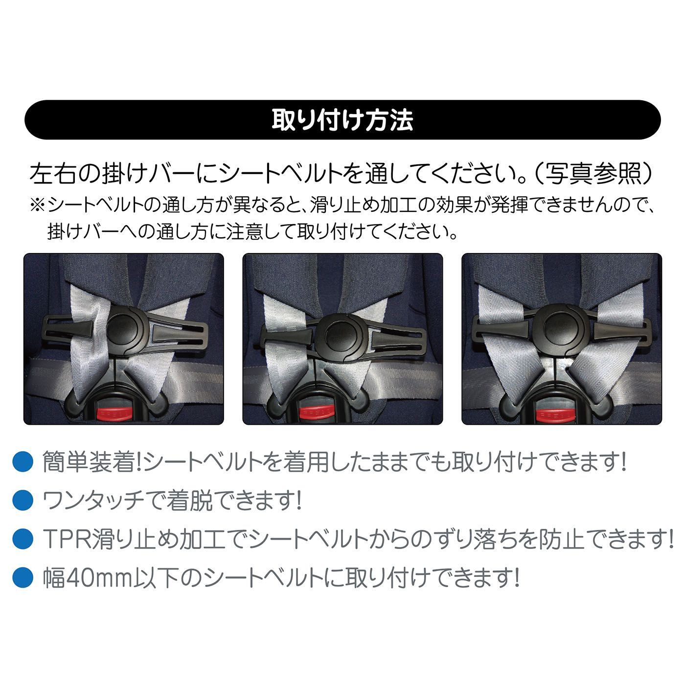 ● 簡単装着!シートベルトを着用したままでも取り付けできます!