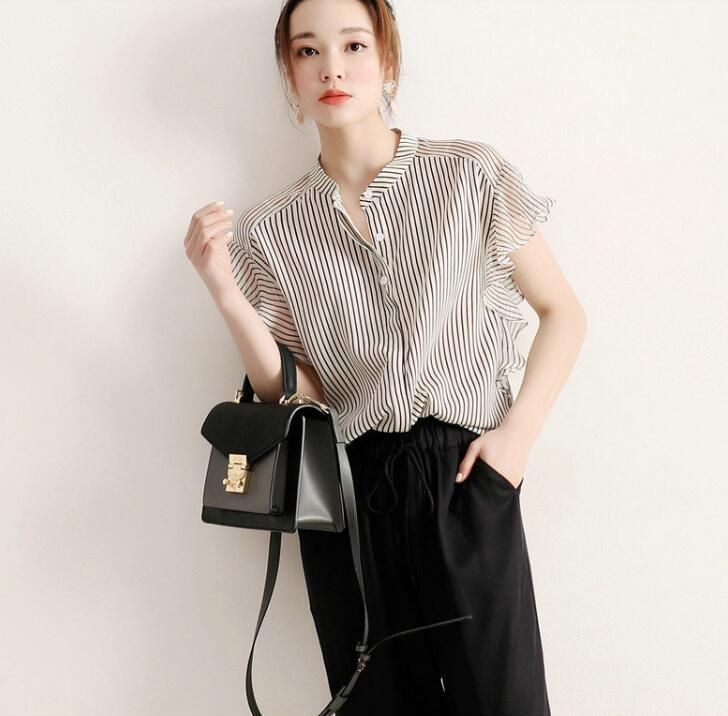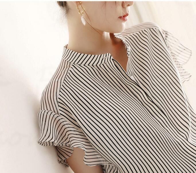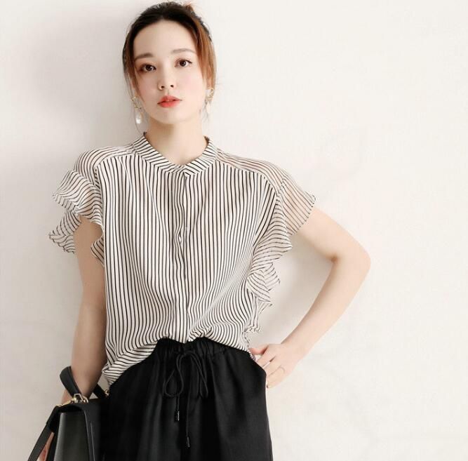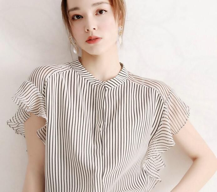 シフォン ストライプ シャツ レディース ブラウス 夏 半袖ブラウス オフィス シャツブラウス レディース おしゃれ 袖口フリル 切り替え 前開き フォーマル オフィス 着痩せ 上品 きれいめ 20代 30代 40代 qe4F736