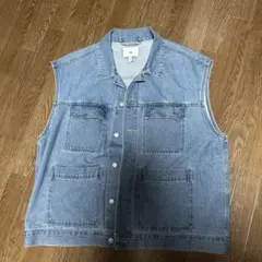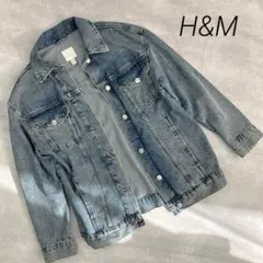 ボタンフロントの青いデニムジャケット、ポケット付きで実用的。