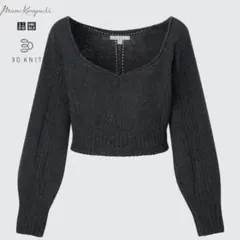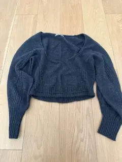 リブ編みのブラウンVネックセーター、フレア袖デザイン。