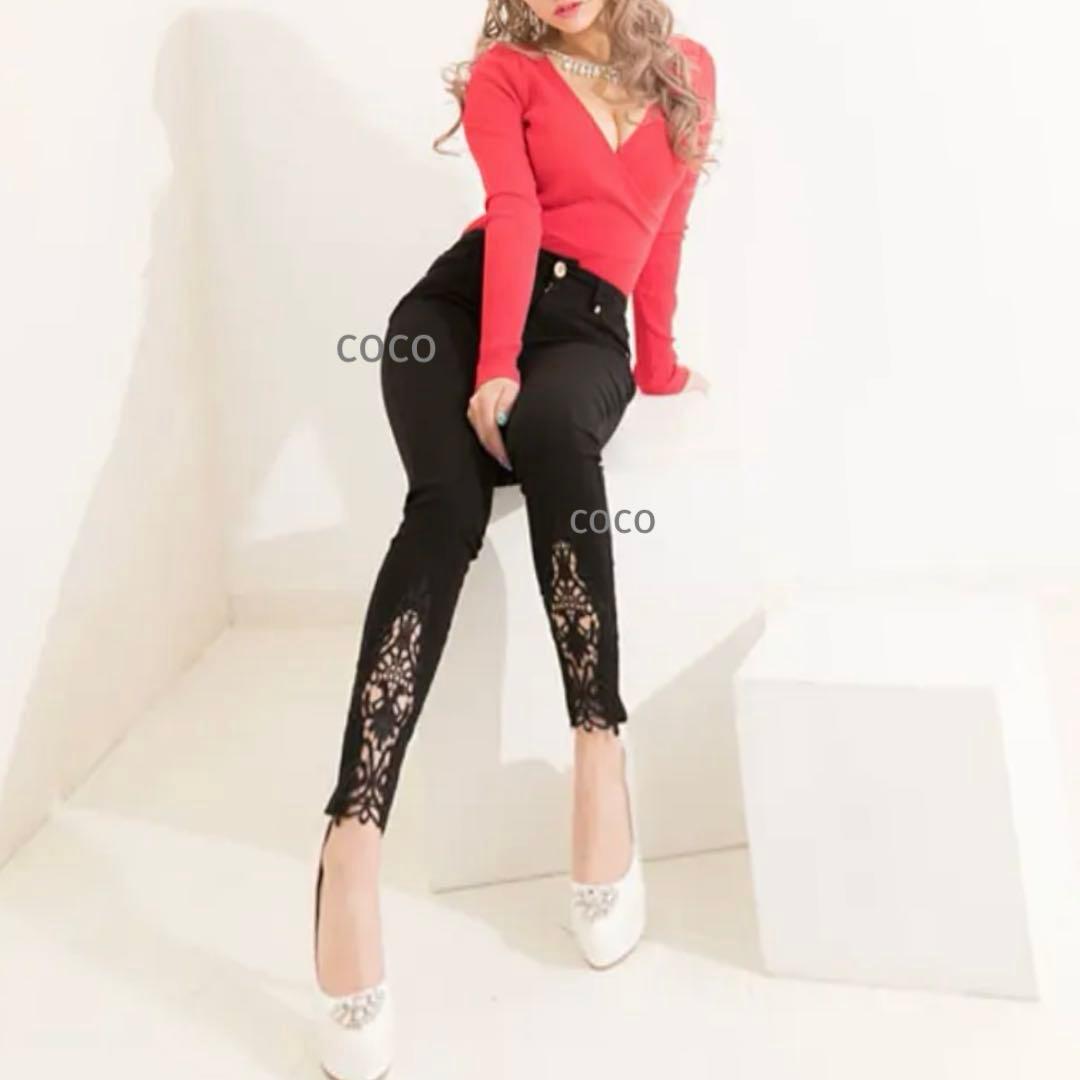 裾レース スキニーパンツ ストレッチ 黒ブラック夢展望Diable baiser
