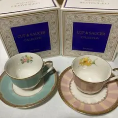 バラの花柄が美しいティーカップ2個セット、陶磁器製、金色の縁取り付き。