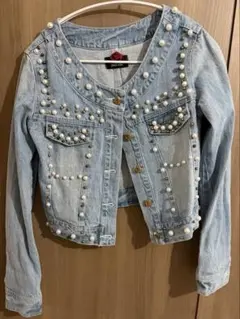 パールとスタッズが施されたライトブルーのクロップドデニムジャケット。
