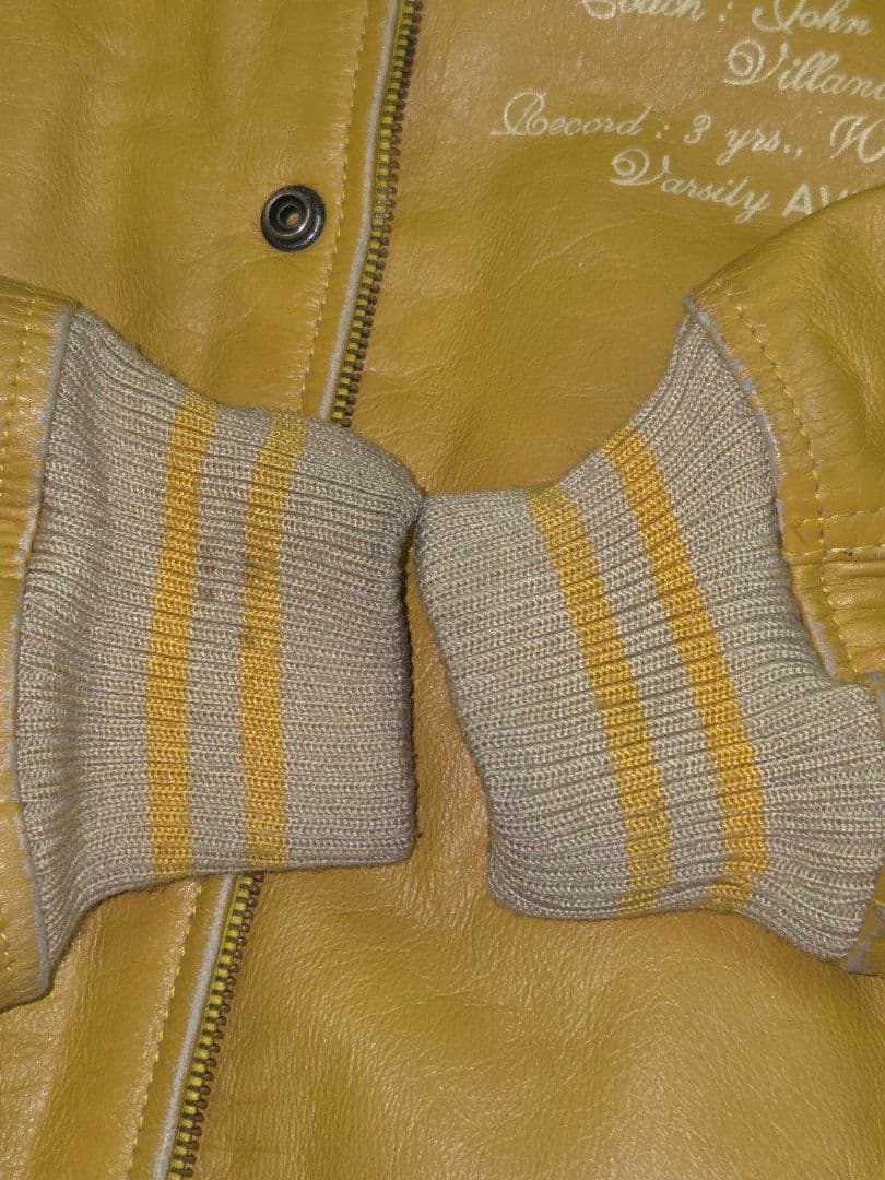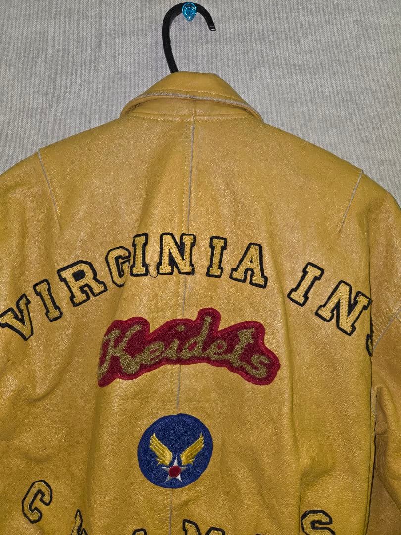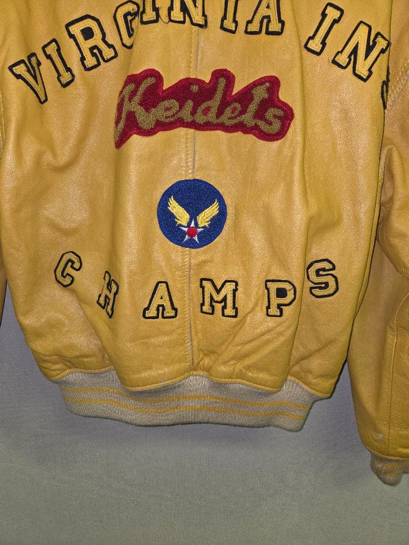 色は、鮮やかな黄色のレザー素材で作られており、背面には「Virginia's Champs」と「Keidel」の刺繍が施されています。