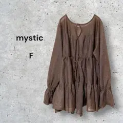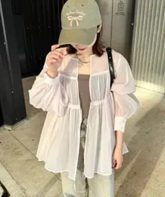 アイボリーのバックオープンデザインで、リボン付きのフレア袖チュニック。
