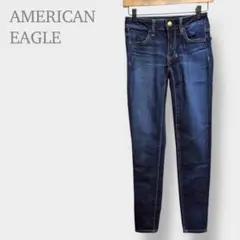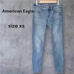 ミディアムブルーのハイライズスキニーデニム、ダメージ加工あり。