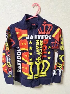 BABYDOLLのジップアップパーカーです。サイズは130cmで、グレーを基調にブルーとイエローのロゴや星柄がプリントされています。着用に伴う多少の色褪せや毛羽立ちが見られます。自宅保管品となります。