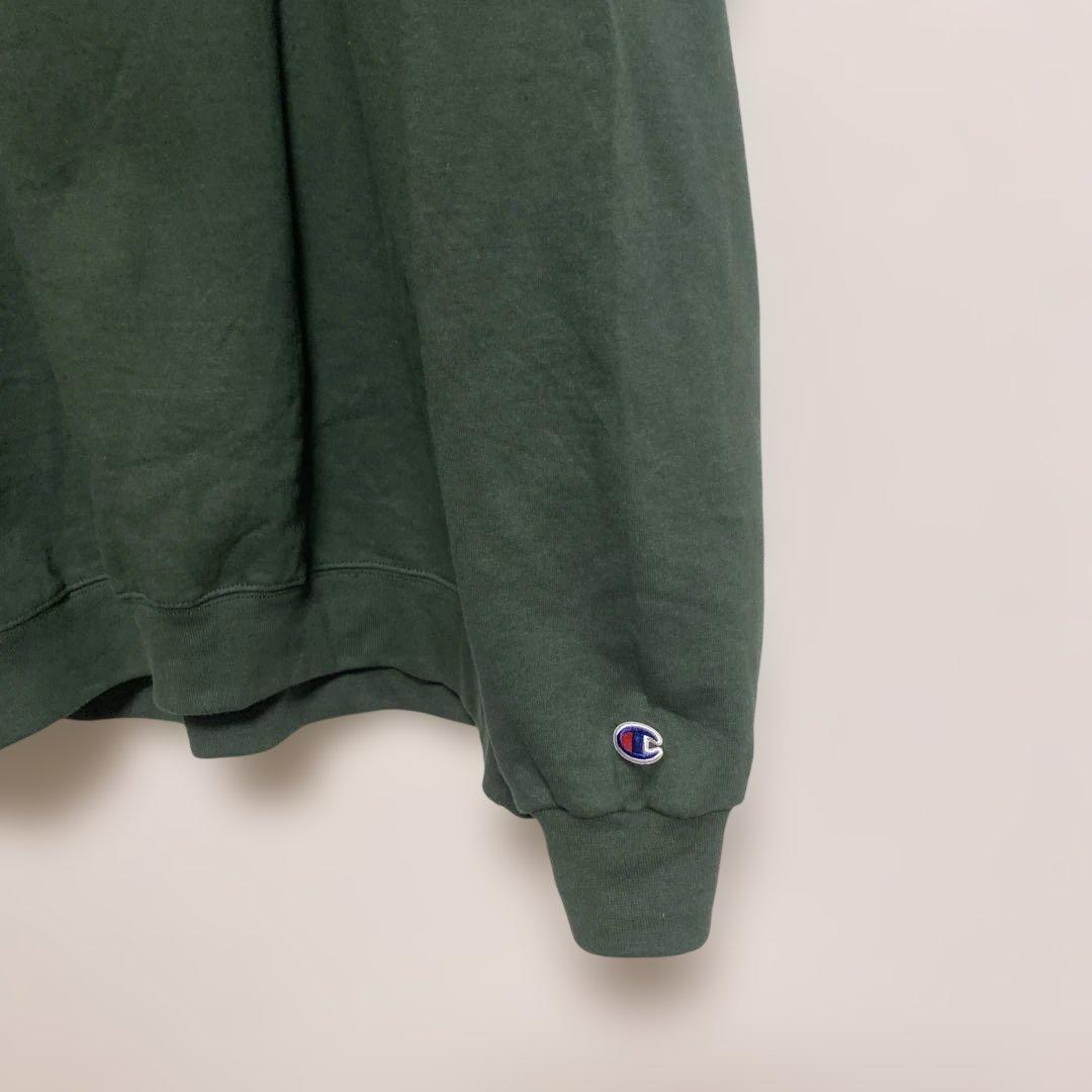チャンピオンのダークグリーンのDURGIN CROWELLロゴが特徴の裏起毛クルーネックスウェット。