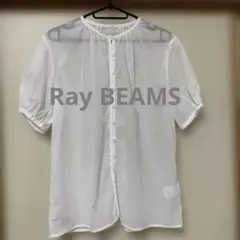 クリーム色のレーヨン混半袖シャツ、ラウンドネックデザイン。