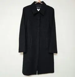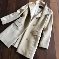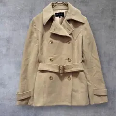 カシミヤ混ウール素材のベージュダブルブレストピーコート、ボタン付きの襟が特徴。