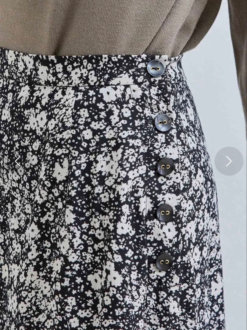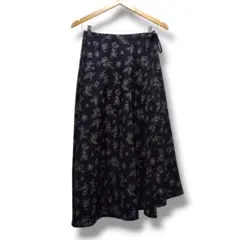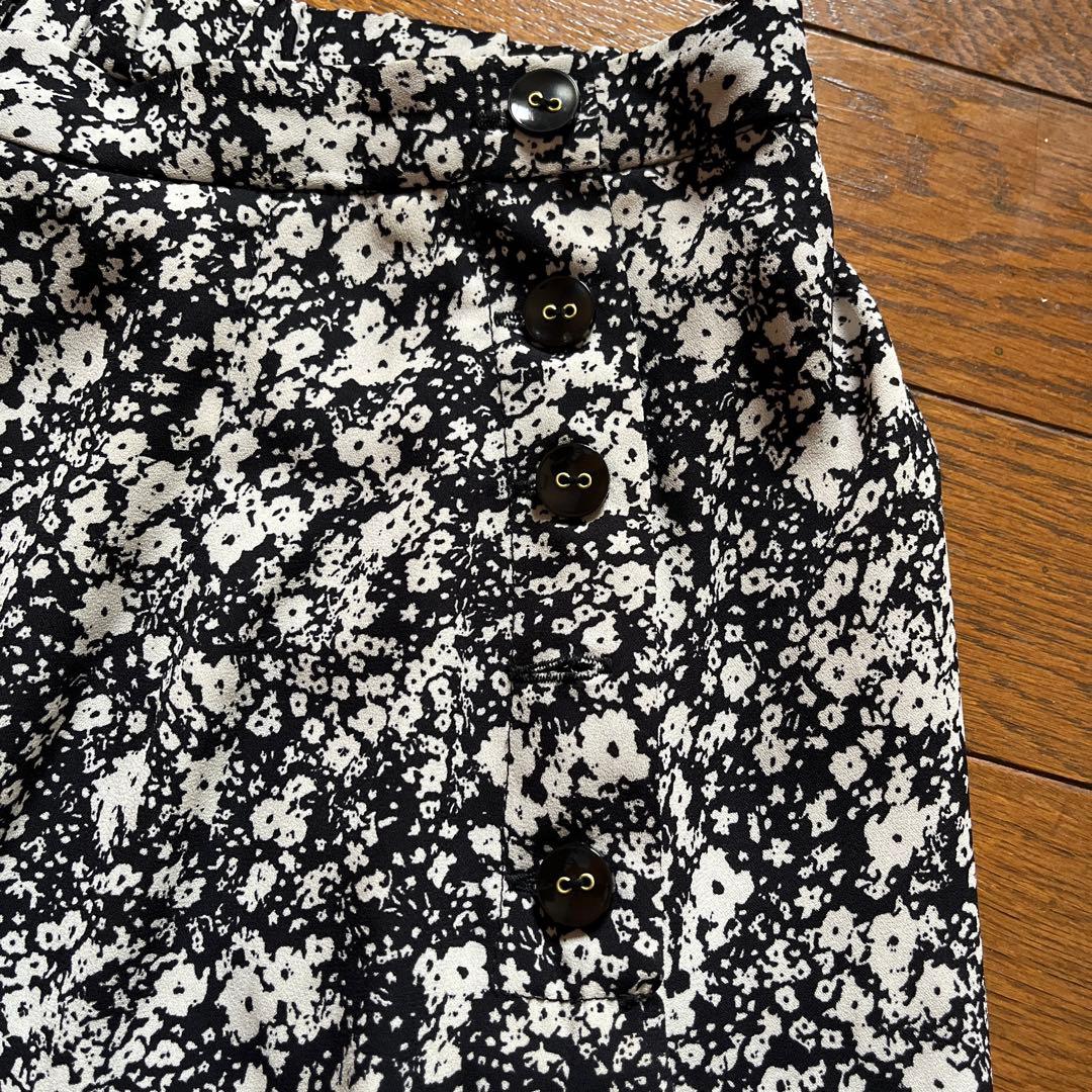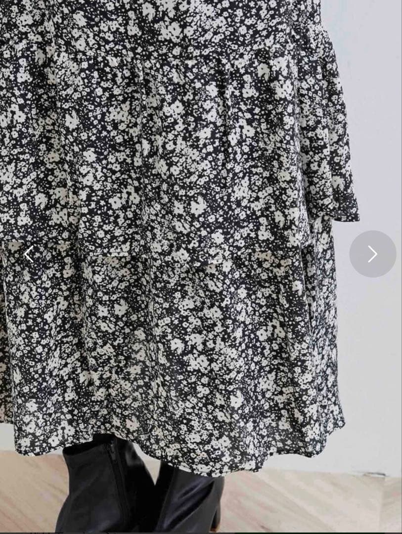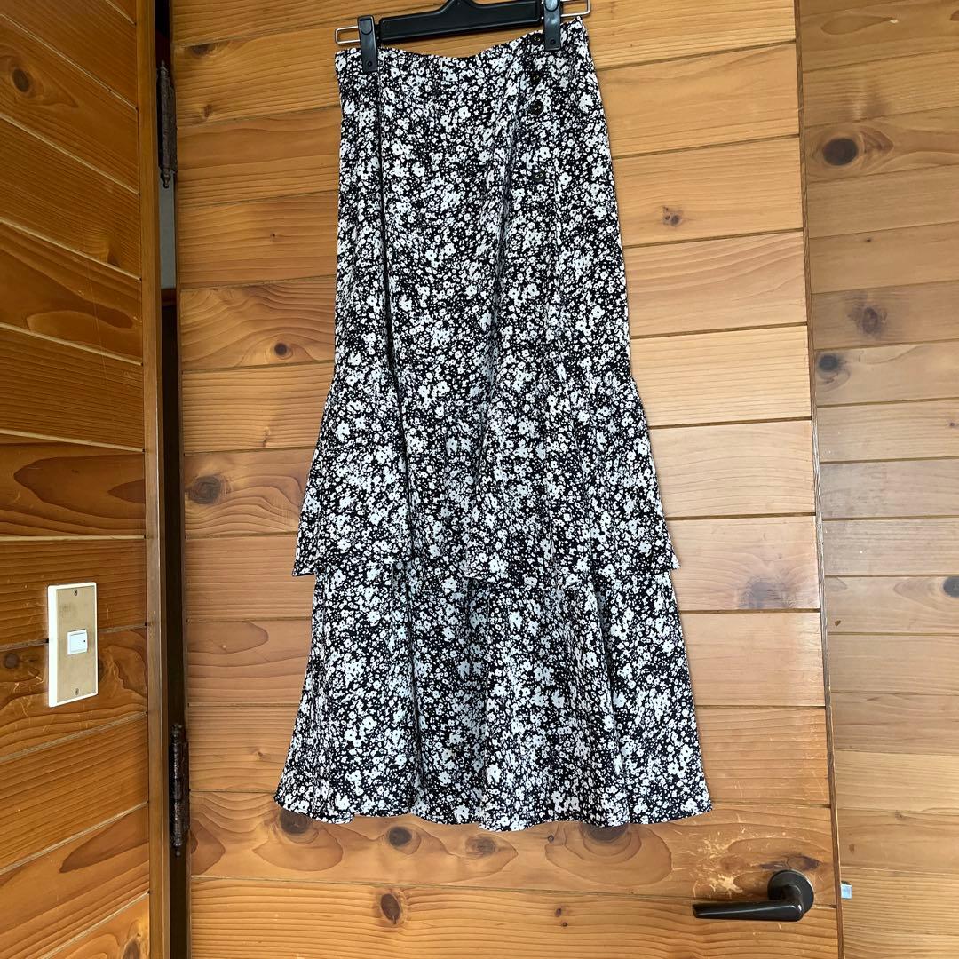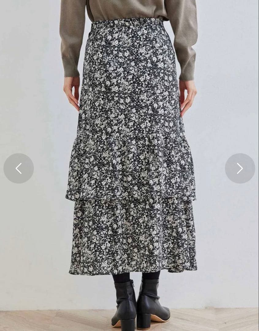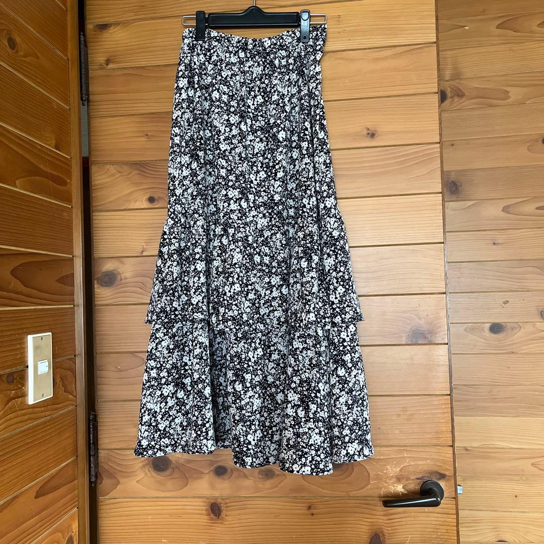 黒と白の花柄のティアードフレアスカート、カジュアルスタイルに最適。