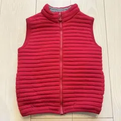 オレンジ色のキルティングベスト、116cmサイズ、ジッパーとポケット付き。