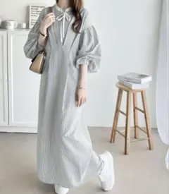 新品 クラシカルエルフ ストライプシャツ シャツワンピース ロング ネイビー