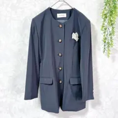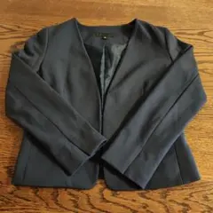 ノーカラーのネイビージャケット、ボタン付きなので軽く羽織ってもOKです。