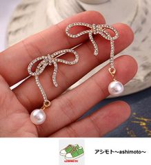 クマ型ゴールドピアス 黒リボン付き♡ベア♡リボン♡パール♡