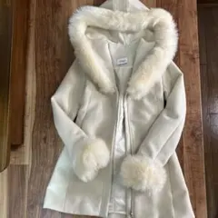 ファー付きのグレーのコート、ウエストリボンデザインでスタイリッシュ。