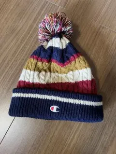 ネイビーのポンポン付きニット帽、赤と白のストライプデザイン、ロゴ付き。