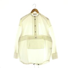 白と緑のストライプデザインの長袖シャツ、ボタンとポケット付き。