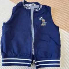 青いボタン付きのファミリアのダウンベスト、ストライプの内側が特徴。