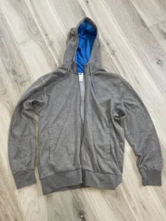 グレーのadidasロゴ入りフード付きパーカー、カンガルーポケット付き。細身です。