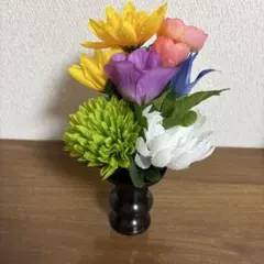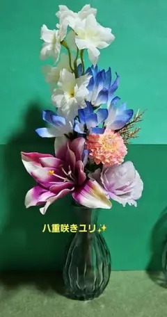 紫とピンクのユリと菊を組み合わせた華やかな造花の花束です。