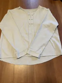 スエード風のベージュ長袖シャツ、Vネックデザインでボタン留め。